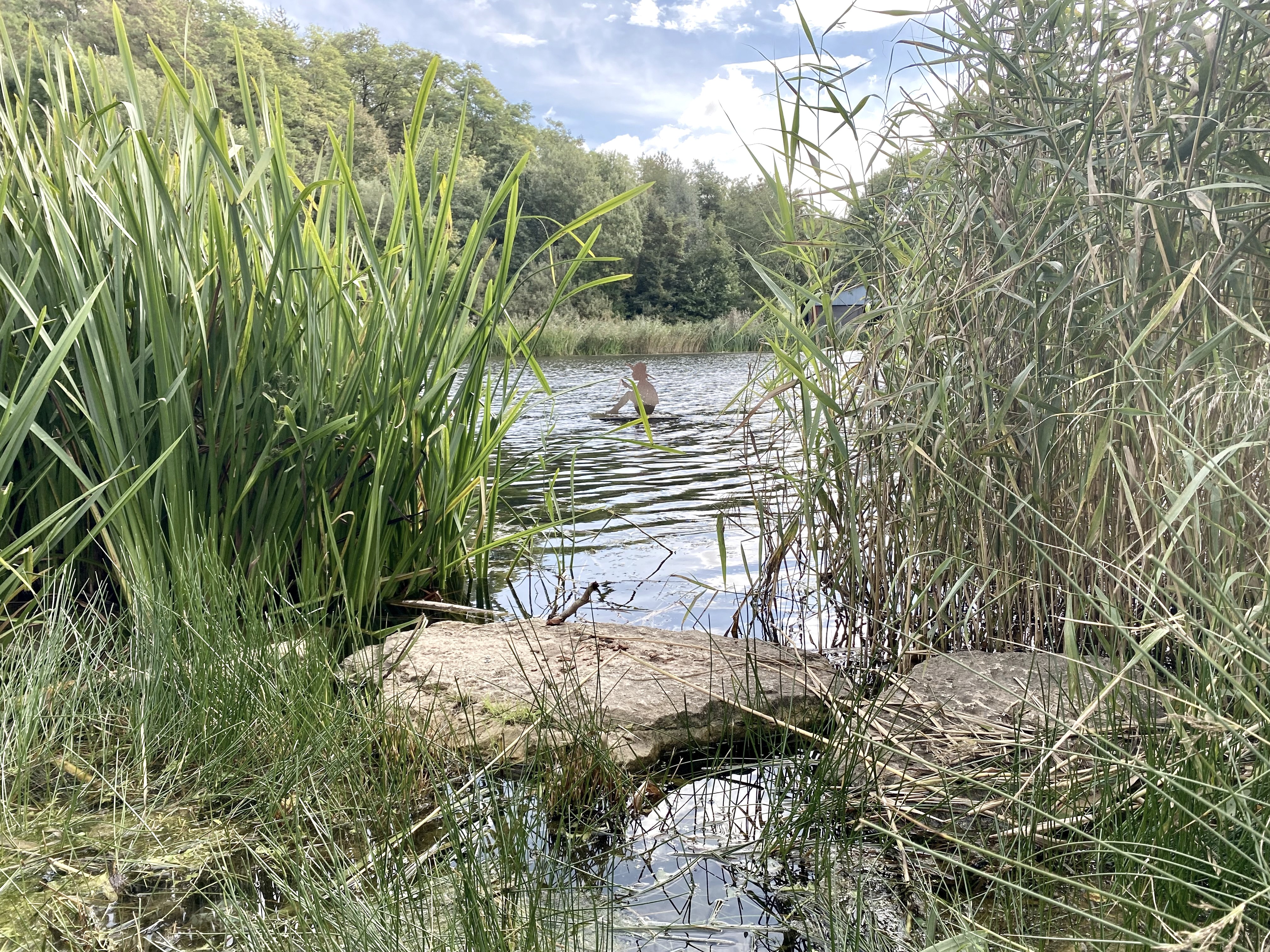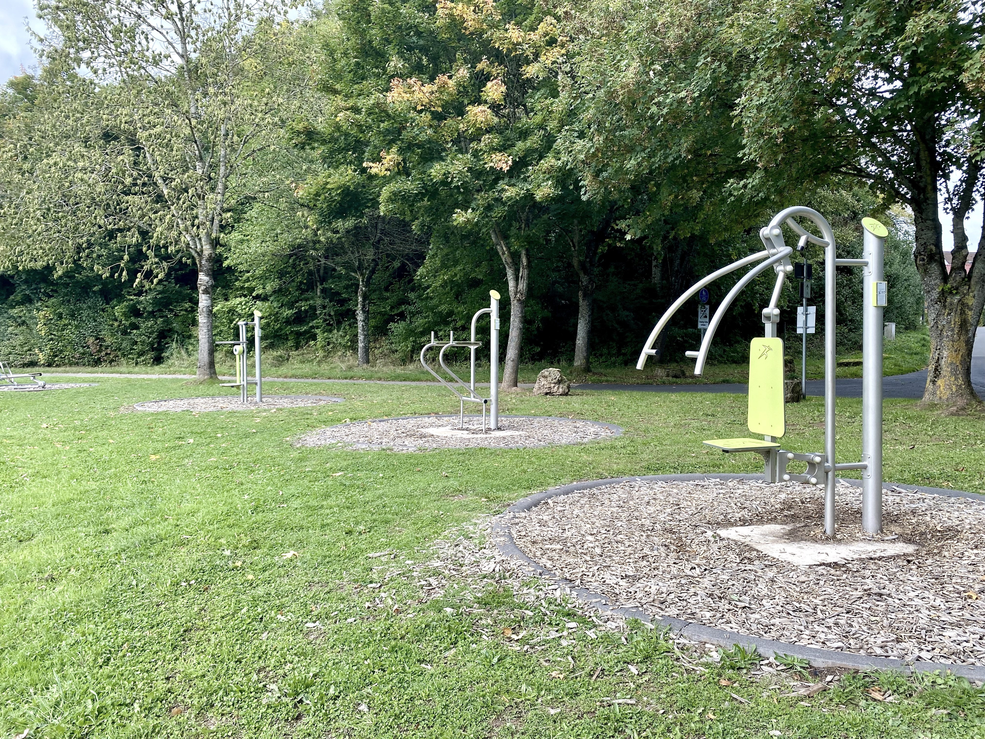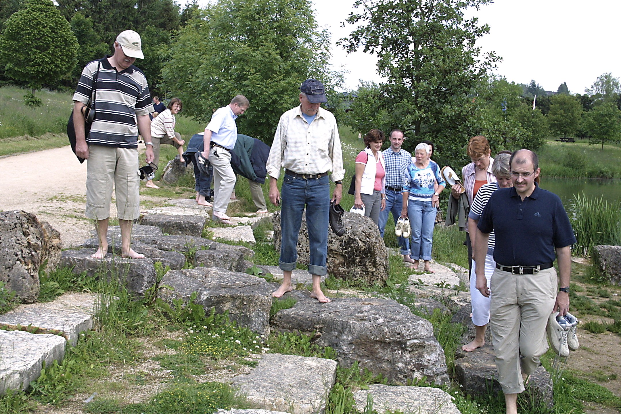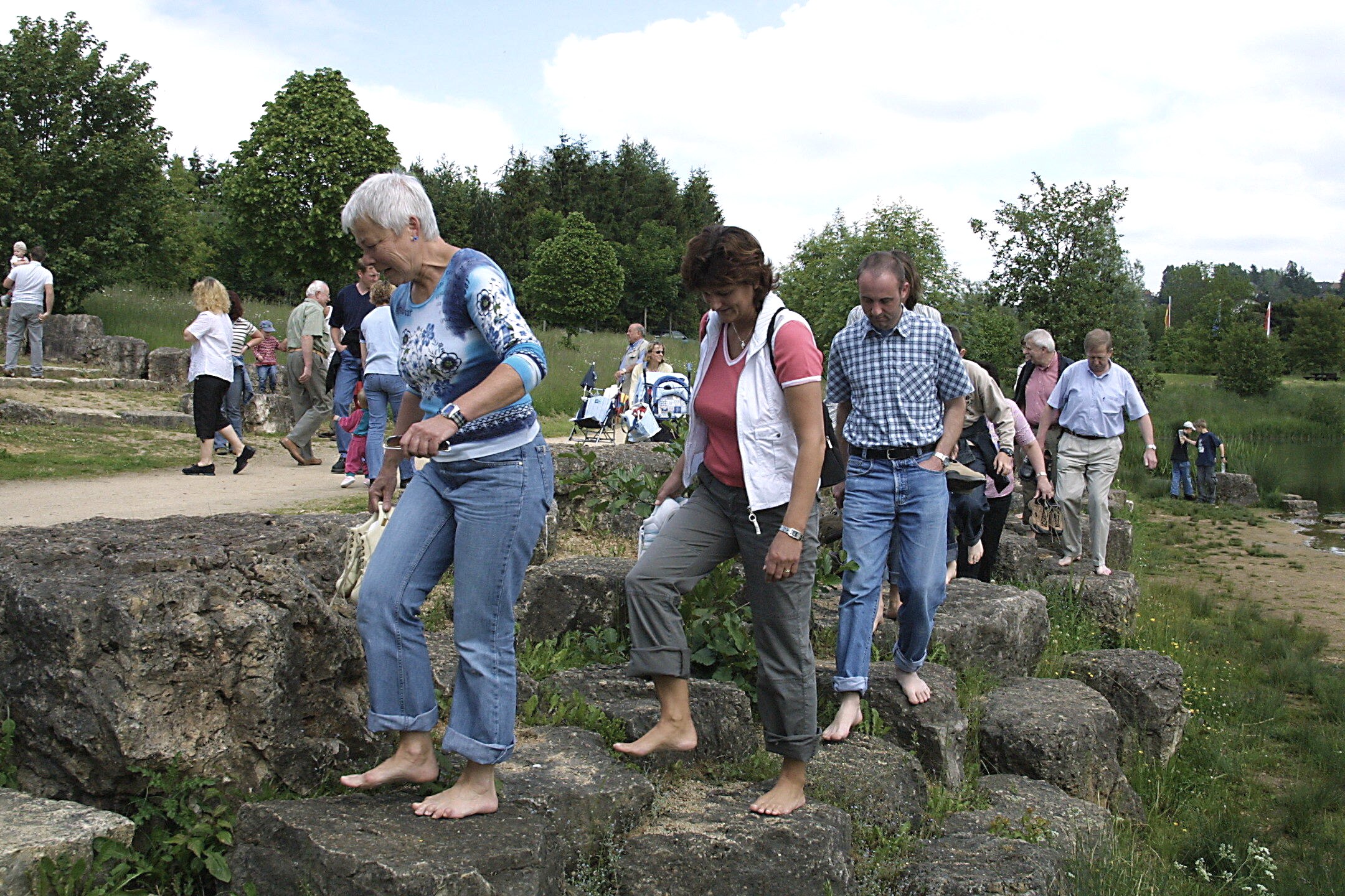 Der Barfußpfad ist 1,6 km lang und hat 22 Stationen. Zunächst führt der Pfad über verschiedene Pflasterbeläge und Sandwege zum See. Hier beginnen, nachdem man eine kleine Abkühlung im Wasser erhalten hat, die Etappen über Meersand, Perlkies, Feinsplitt, Grobkies, Lavasand, Baumrindenschrott oder Mulch zur Bachbrücke. Hier geht es entweder durch die Kiesfurt oder über die Brücke und dann über Knüppeldamm, Trittplatten, Rasenbankette und Balancierbalken. Wer Lust hat, nimmt anschließend den Klettersteig zur Kalksteinhöhle und nach einer Wiesenetappe kommt man zurück zum See, wo wieder eine Abkühlung im Wasser angesagt ist. Ihrer Gesundheit zu Liebe: Machen Sie sich auf den Weg!