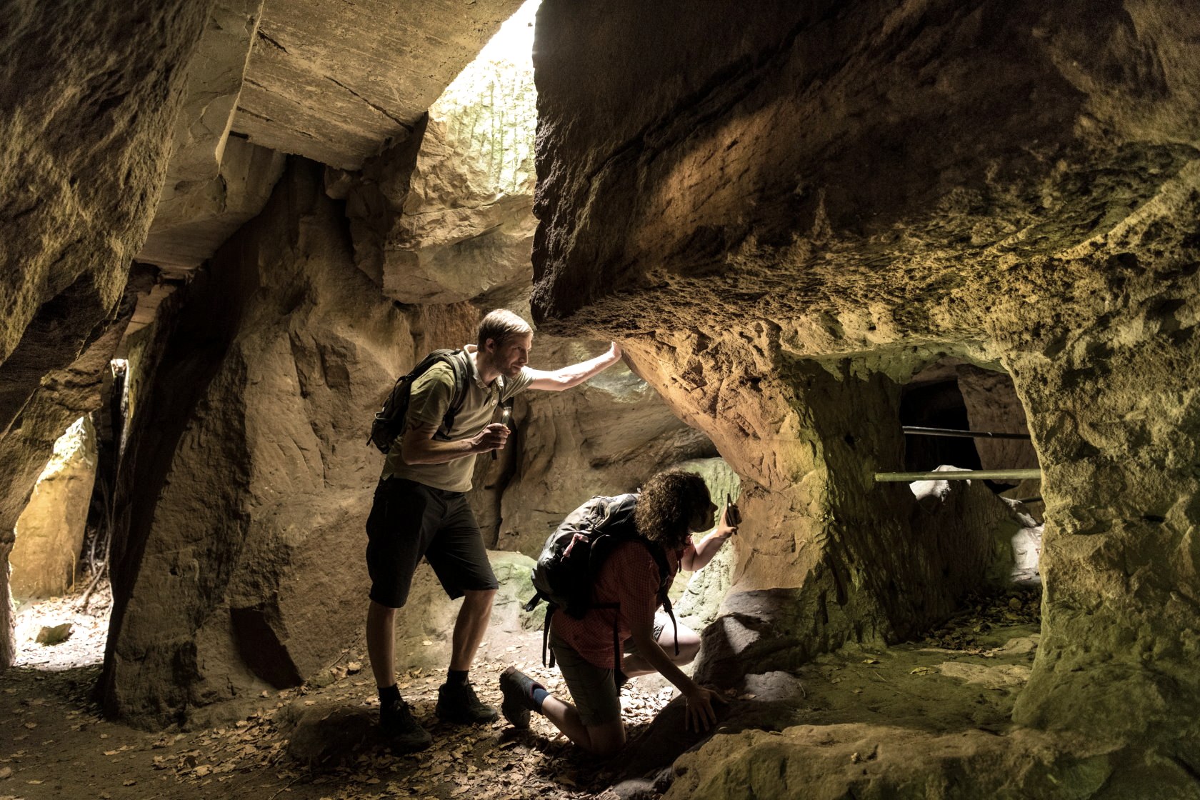 Auf den ersten Schritten bist Du im malerischen Kylltal unterwegs, ein leichtes Plätschern des kleinen Flusses begleitet Dich und bringt Dich in Schwung für den Tag. Dann wird es felsiger, ein Bach windet sich Stein für Stein durch das Tal, manchmal sogar als kleiner Wasserfall. Um Dich herum ursprüngliche Natur, wildes Grün, Du fühlt Dich ein wenig wie auf einer Expedition. Du fragst Dich: Wie komme ich auf die andere Seite des Baches? Dann entdeckst Du die breiten Steine über die Du trockenen Fußes durchs Wasser kommst. Und nicht nur das. Auch Hängebrücken überspannen das glitzernde Wasser hier im Butzerbachtal. Wackeln die etwa? Nur ganz leicht und der Boden ist ja in Sichtweite, das schaffst Du locker und hast Spaß dabei. (Hinweis: Der Abschnitt durch das Butzerbachtal ist gesperrt. Eine Umleitung ist ausgeschildert). Nach dem wild-romantischen Tal fällt Dir ein seltsames Bauwerk auf: Scheint wie ein kleines Bergwerk, mitten in der Natur? Tatsächlich, es ist ein römisches Bergwerk mit dem Namen "Pützlöcher".