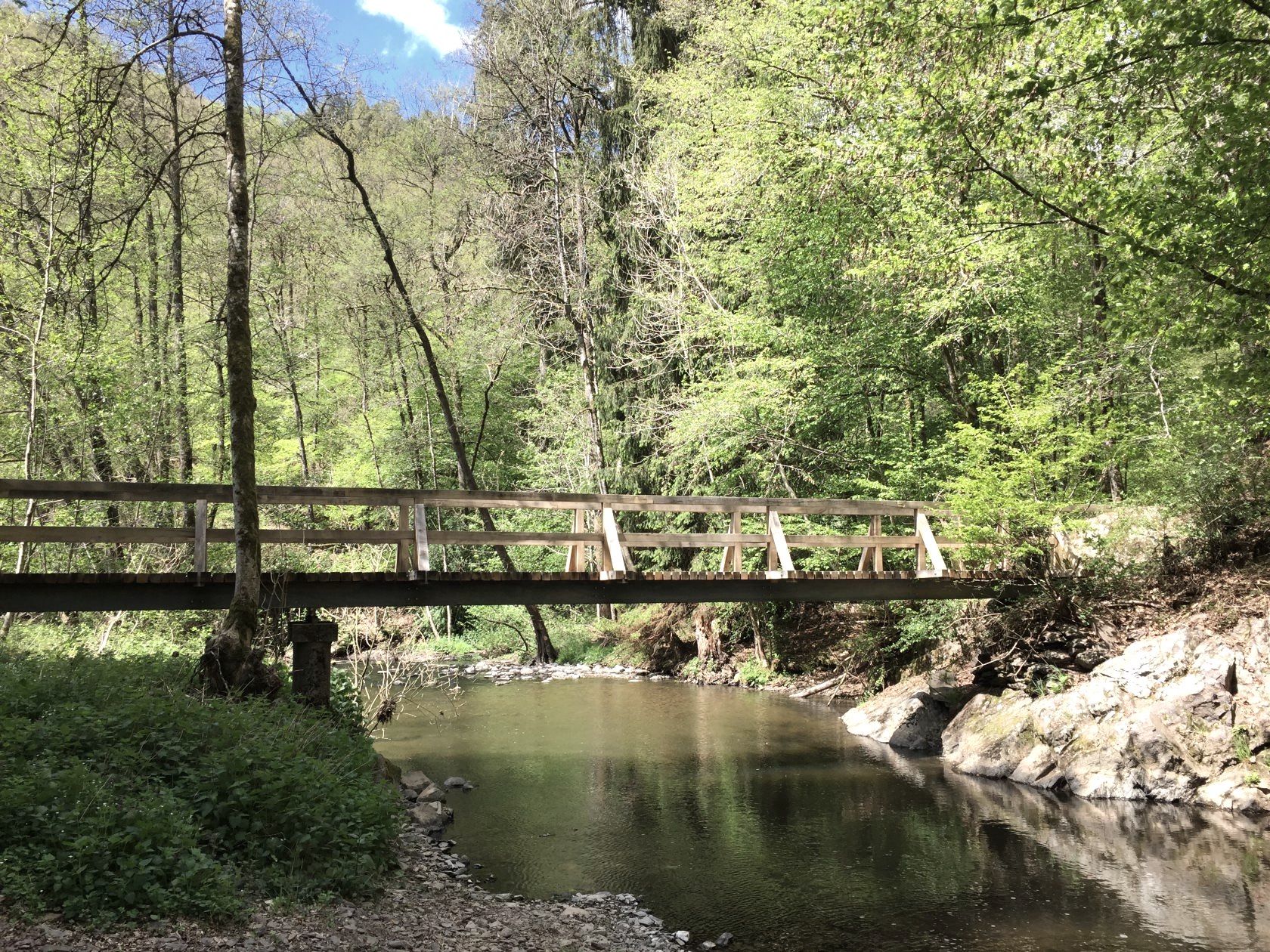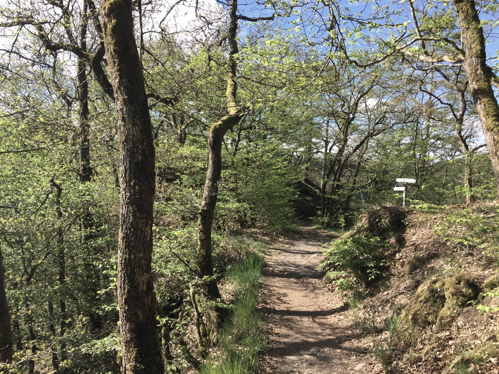 Der Grafschaft-Pfad mit Start in der Burgenstadt Manderscheid verläuft zum Teil auf Eifelsteig und Lieserpfad und führt durch die Ortschaften Pantenburg und Laufeld. Auf schmalen Pfaden und entlang von hochaufragenden Felsen geht es vorbei an einigen Hütten mit Ausblicken hinab zum Burgweiher und zur Lieser. Aus dem Tal geht es durch lichten Wald teilweise steil, teilweise moderat hinauf auf die Höhe bis nach Pantenburg. Von hier öffnet sich der Blick wieder auf die Manderscheider Burgen. Auf der Höhe führt der Weg teilweise über Schotterwege durch offenes Gelände und entlang von Wiesen bis nach Laufeld. Doch schon bald geht es wieder hinab zum Tal des Falbachs, vorbei an einem interessanten geologischen Aufschluss. Außer dem munteren Plätschern des Baches und Vogelgezwitscher ist hier kaum etwas zu hören. Pure Waldeinsamkeit. Der Falbach mündet in die Lieser und so folgt man nun der Lieser auf ihrem Weg zurück bis nach Manderscheid.