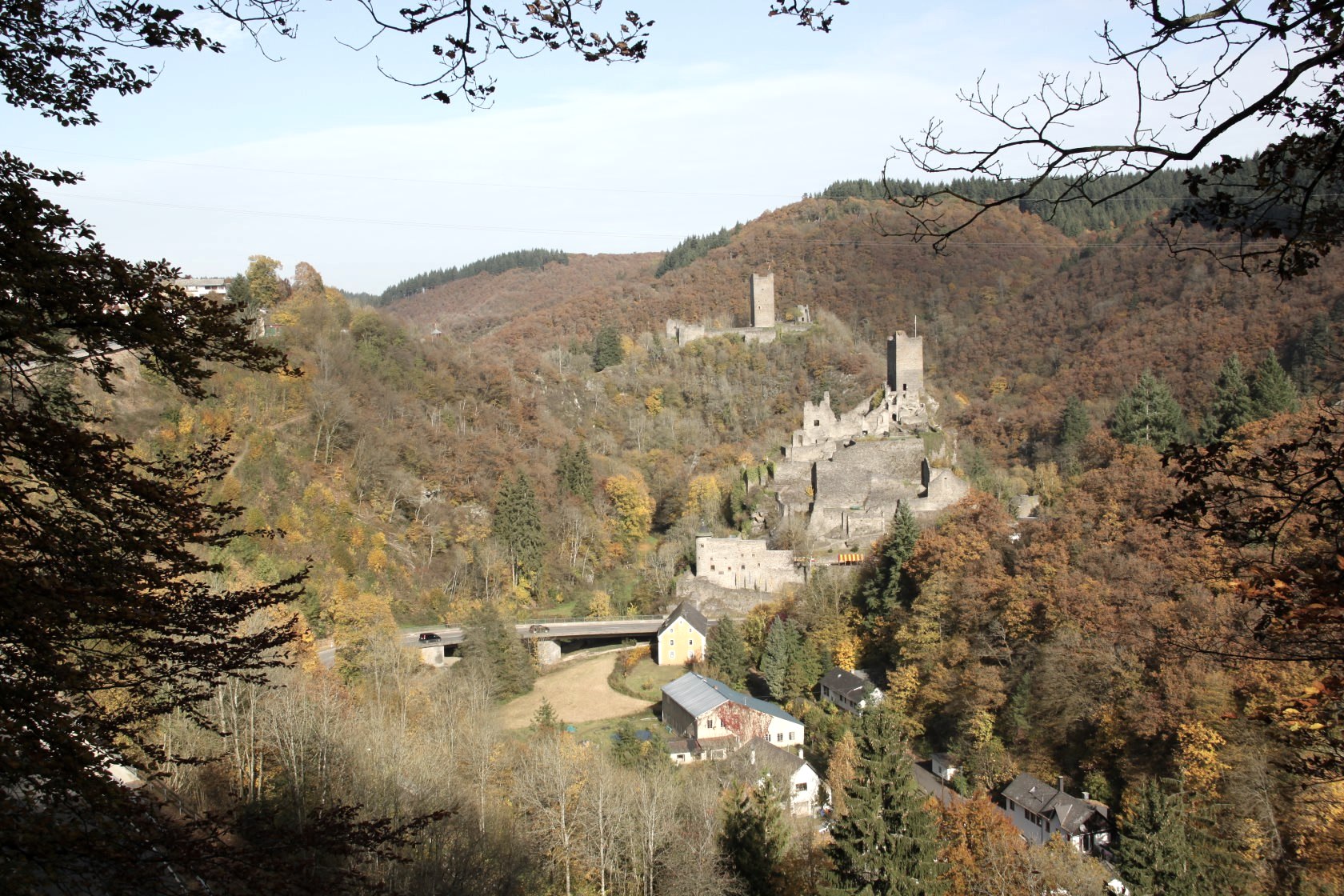 Der Grafschaft-Pfad ist ein anspruchsvolles Sahnehäubchen unter den Touren durch die Vulkaneifel. Dramatisch ist schon der Einstieg, mit den gewaltigen Burganlagen der Ober- und Niederburg Manderscheid - auf knapp 400 m steht man vis-a-vis mit der Burgenstadt Manderscheid.