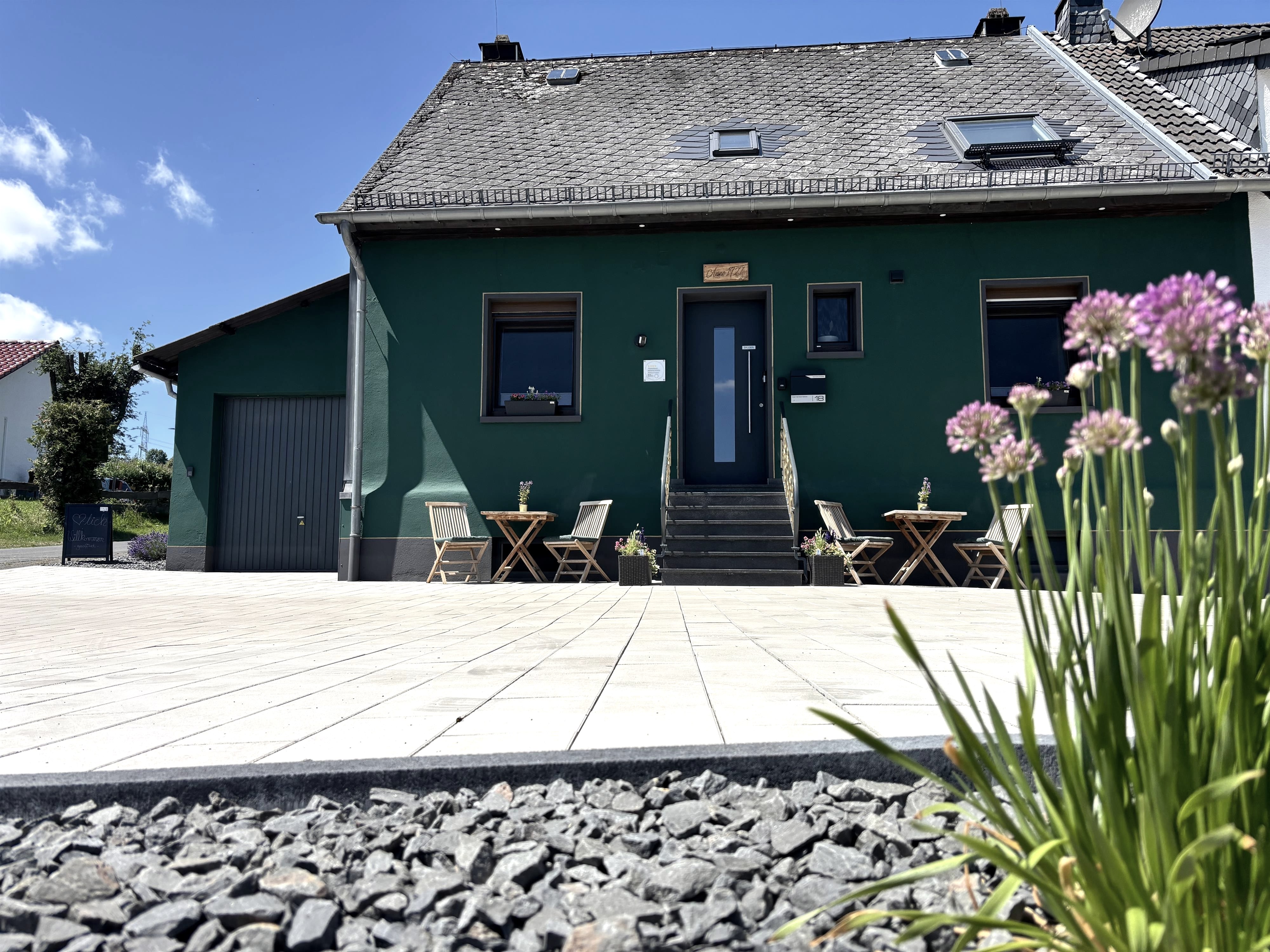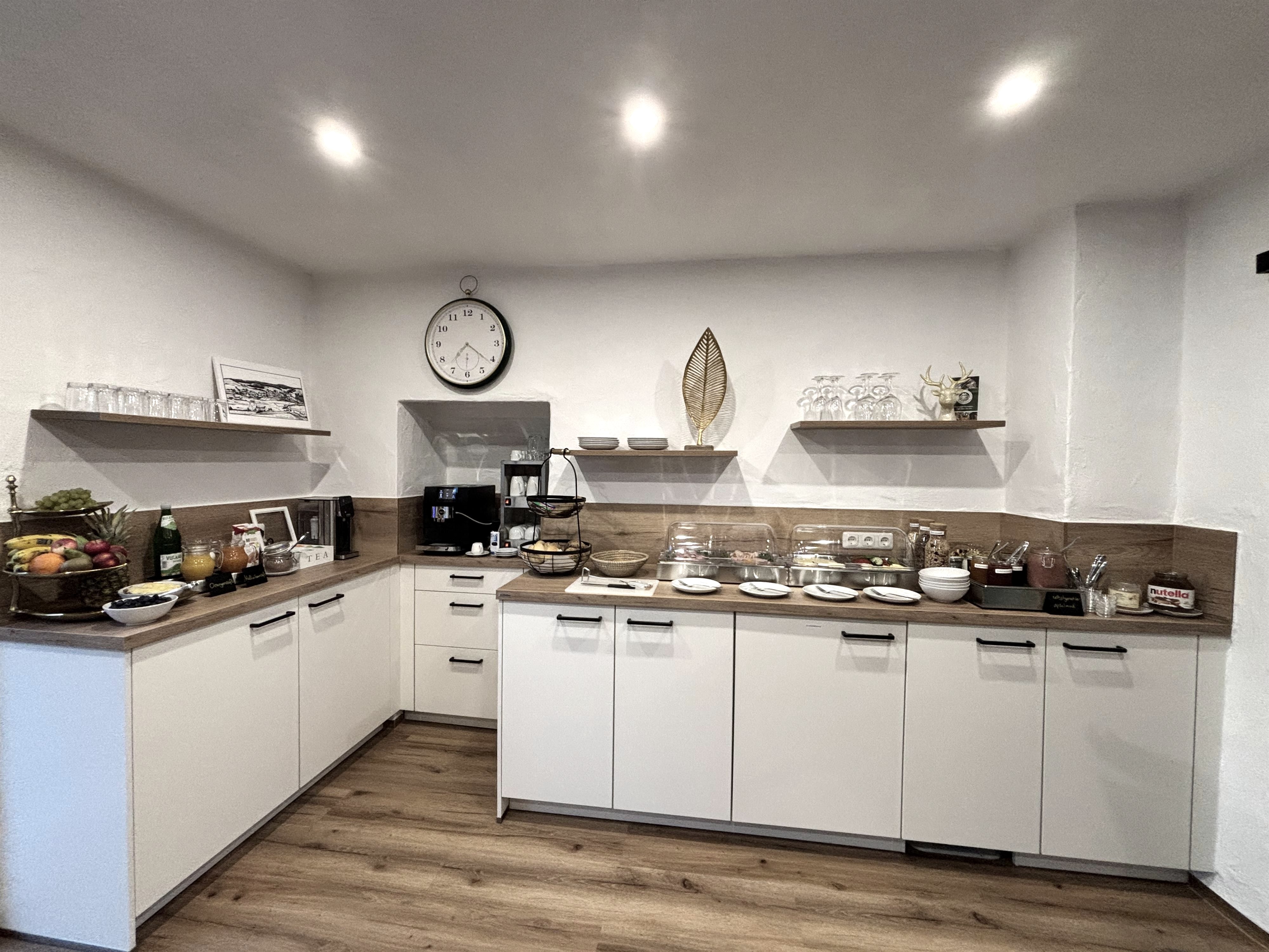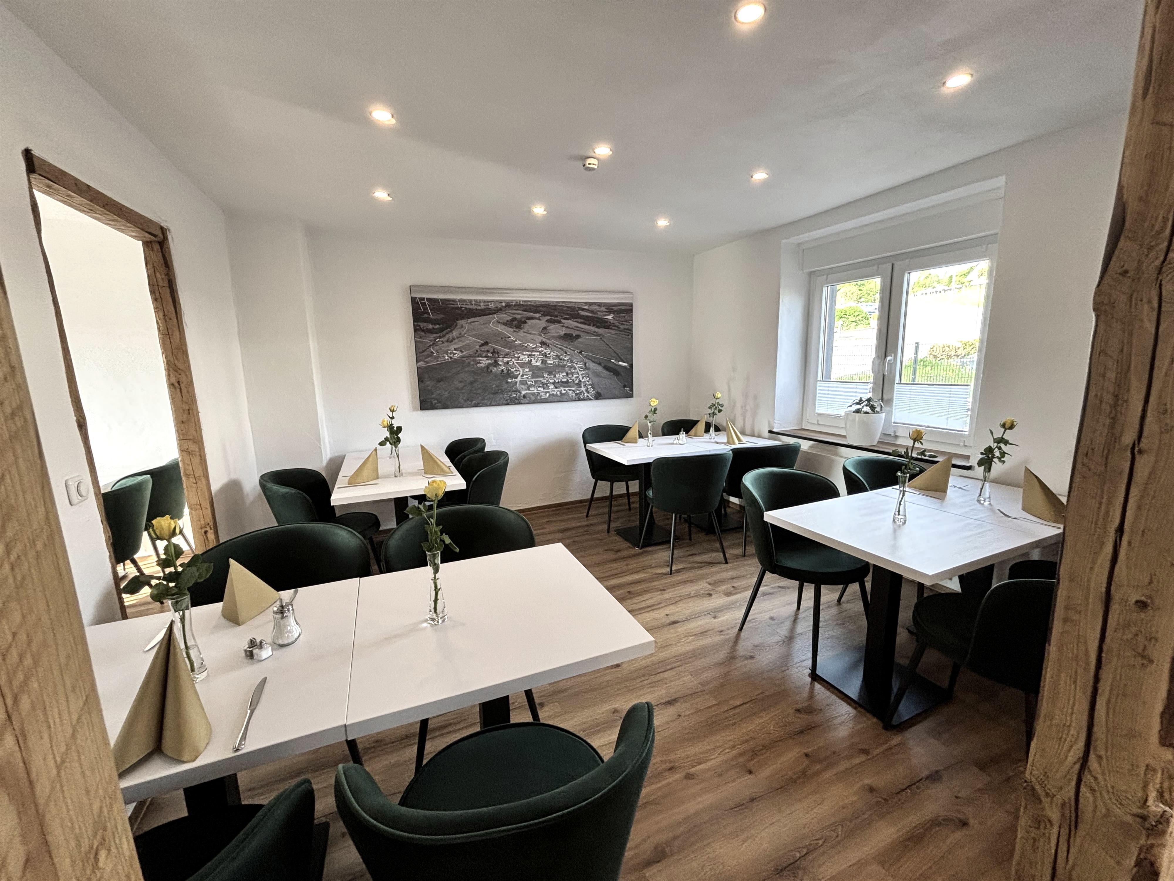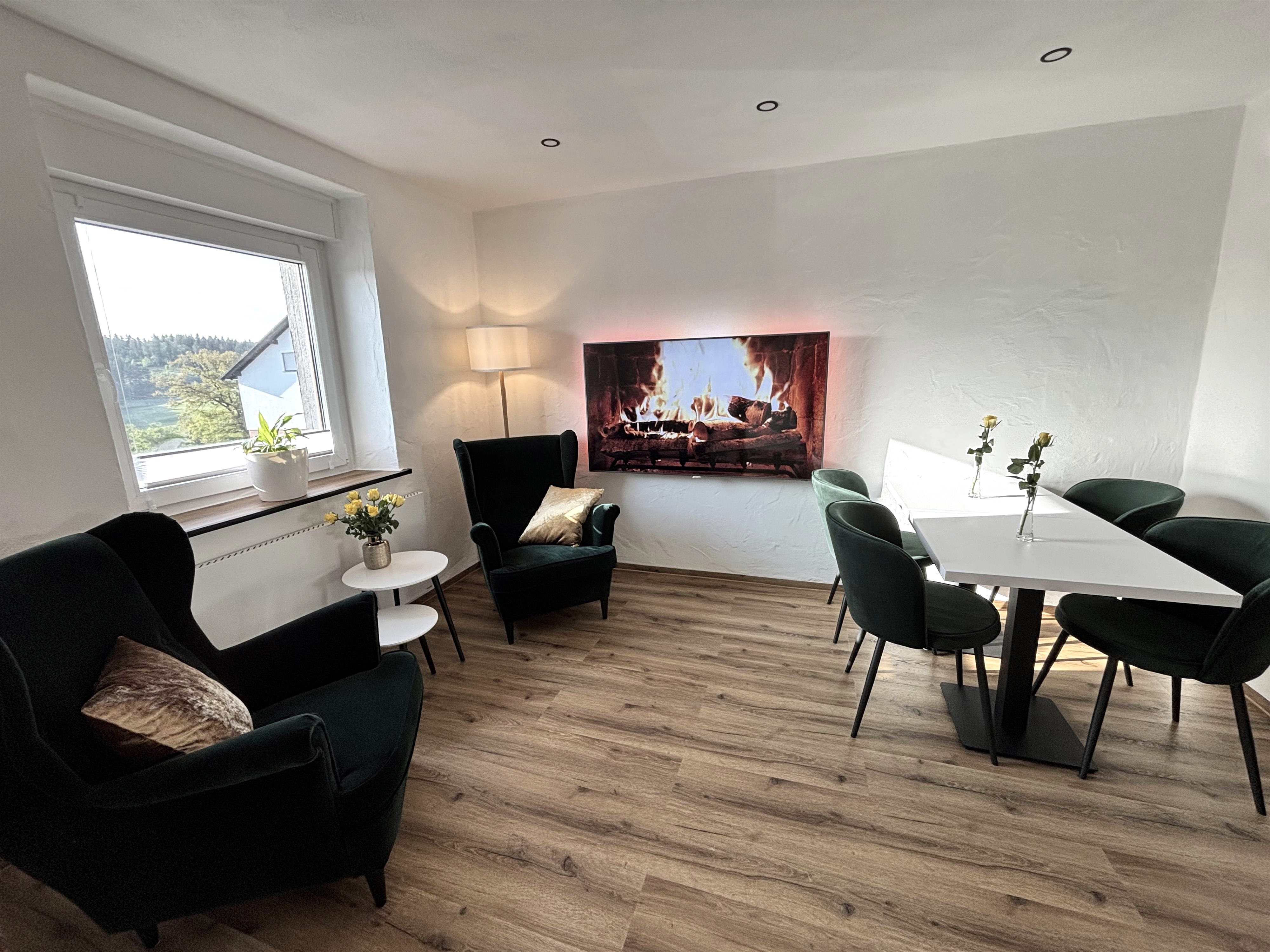 An schönen Tagen sorgt die einladende Terrasse für einen Blick ins Grüne, während der Innenraum ganzjährig wie ein gemütliches Wohnzimmer bei Freunden wirkt – heimelig, warm und willkommen.