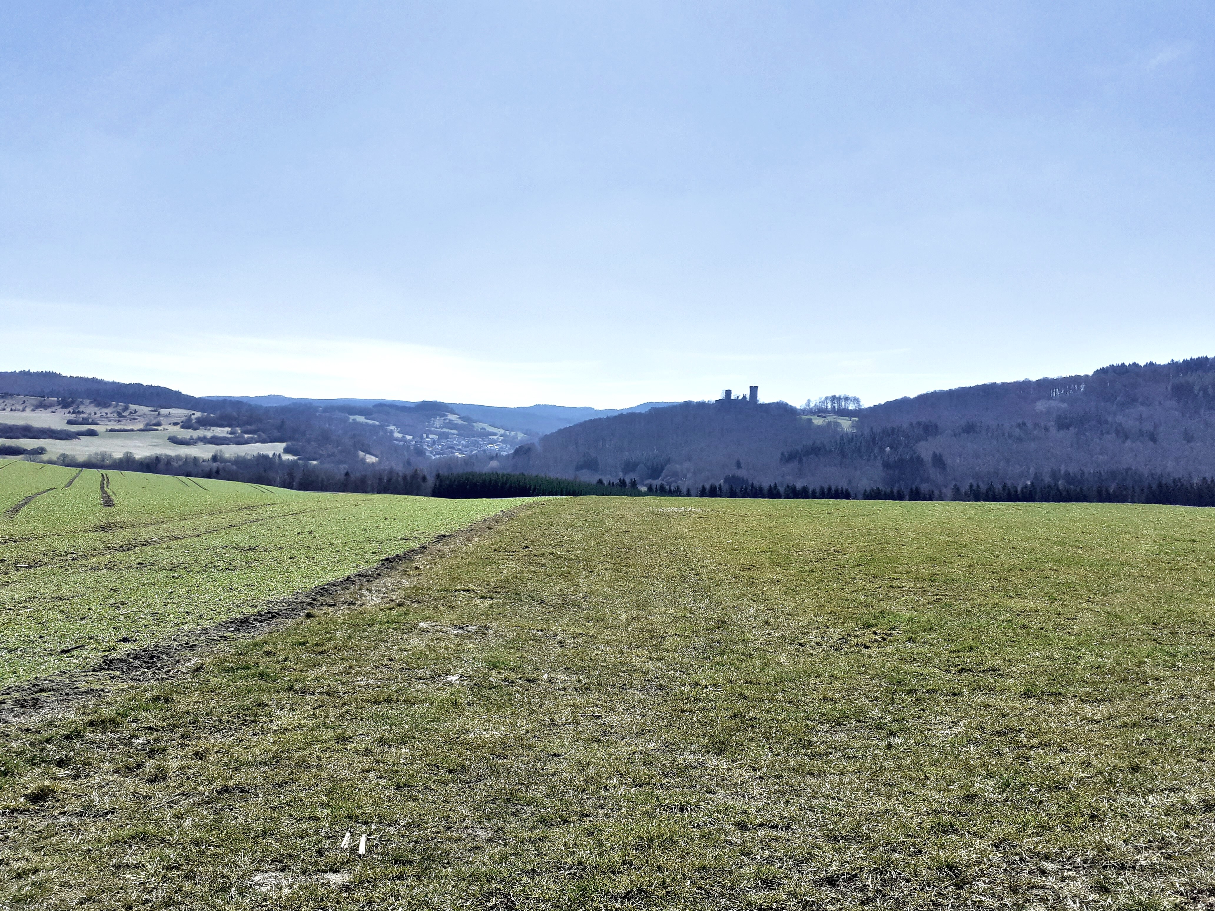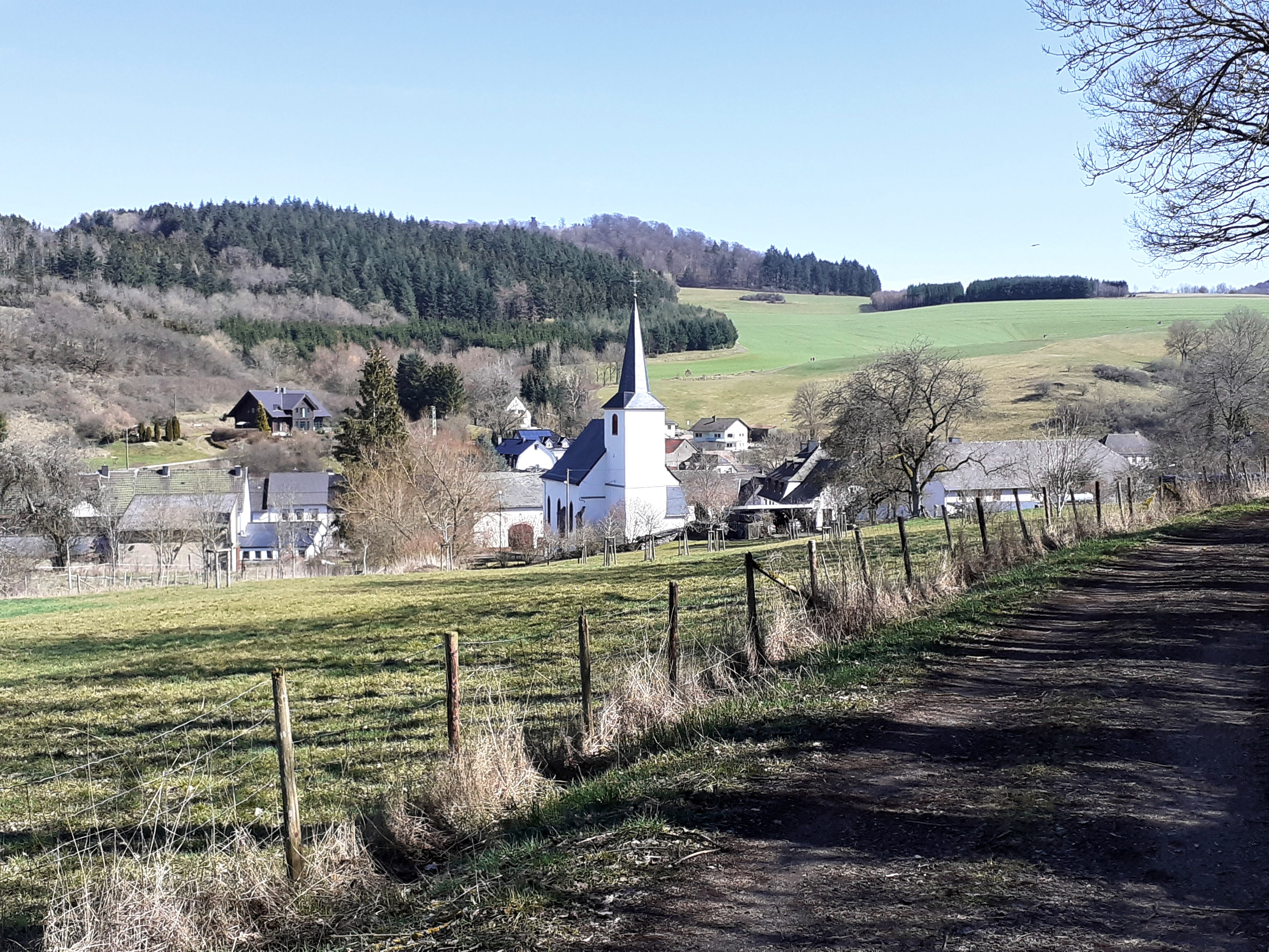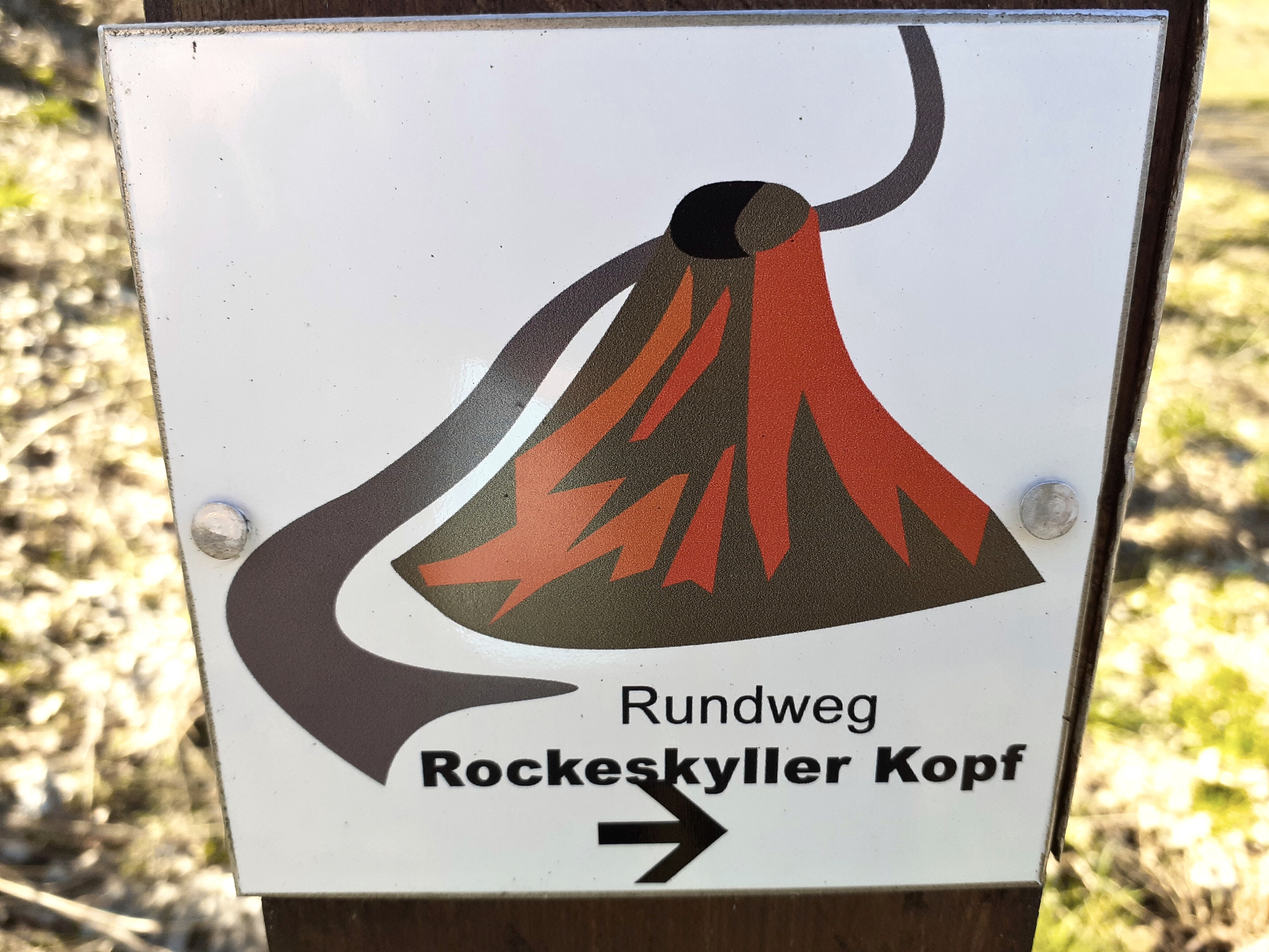 Startpunkt der Rundwanderung ist der Parkplatz im Ortskern von 54570 Rockeskyll. Wir gehen die Dorfstraße hinauf vorbei am örtlichen Sportplatz. Dahinter machen wir einen großen Bogen vorbei am Rockeskyller Kopf, der sich uns rechts vom Weg zeigt.