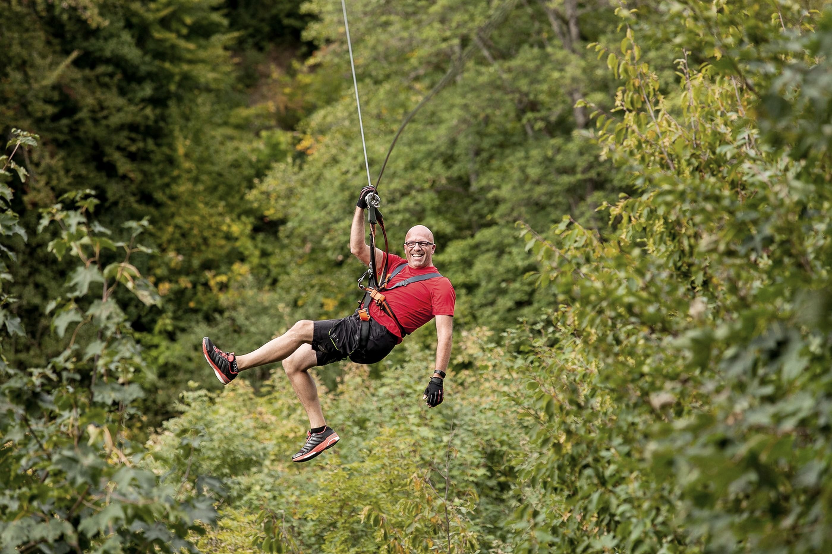 • 12 atemberaubende Ziplines inkl. Mega-Zips über das gesamte Berlinger-Bach-Tal