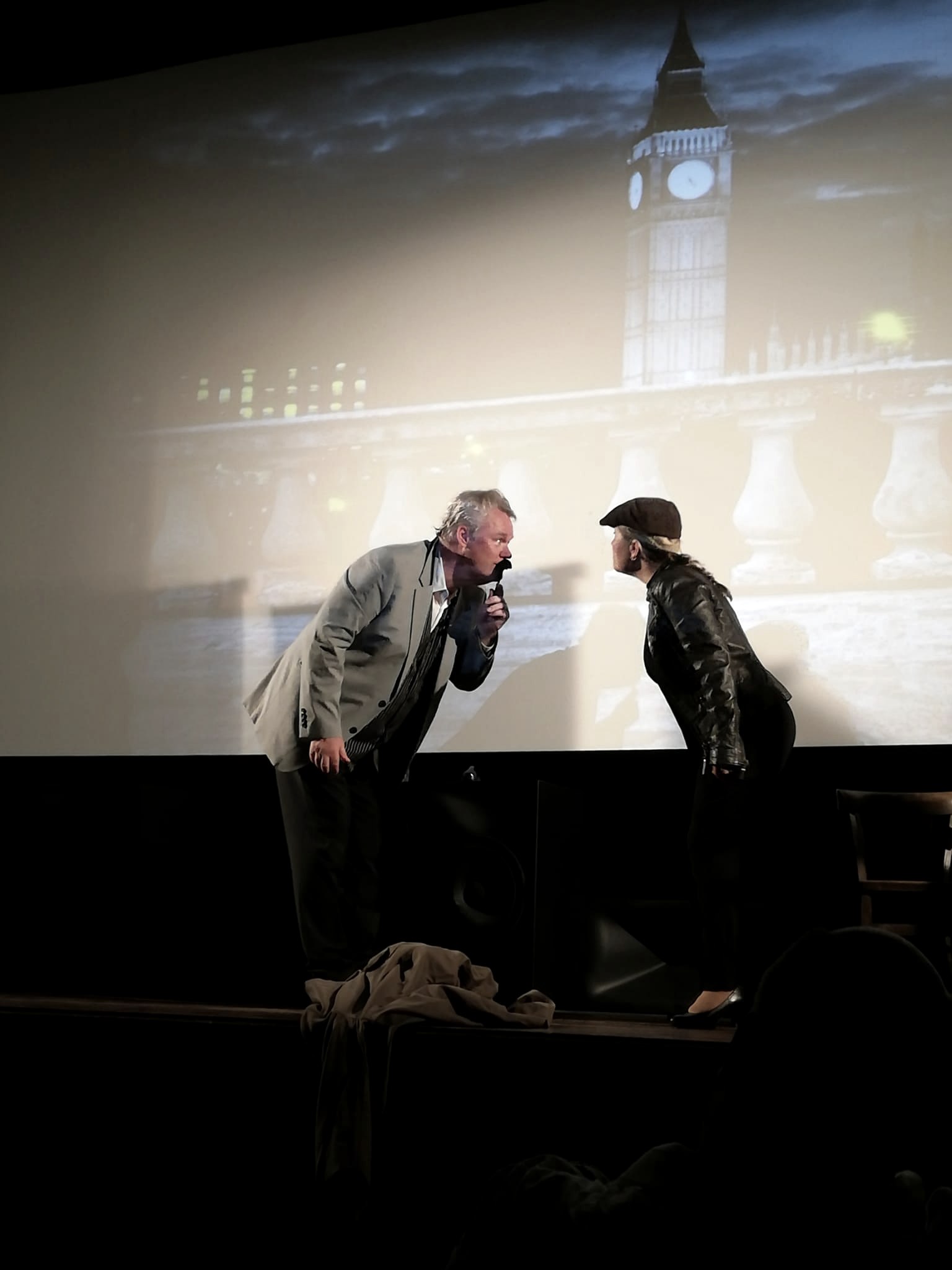Und am Abend wurde schließlich in der Eifel-Film-Bühne die turbulente Krimi-Komödie „Der Mönch mit der Klatsche“ aufgeführt. Frei nach Edgar Wallace hat Schauspieler und Autor Stefan Keim diesen wunderbaren Thriller-Spaß mit Nostalgieeffekt kreiert: In wilder Improvisation zauberten die beiden Vollblutkomödianten Michaela Schaffrath und Stefan Keim eine irrwitzige Krimishow auf die Bühne. Ausgestattet mit ein paar Kostümen und spärlichen Requisiten schlüpften die beiden in Sekundenschnelle in unzählige Rollen und sorgten damit für ein hellauf begeistertes Publikum und für unzählige Lacher.
