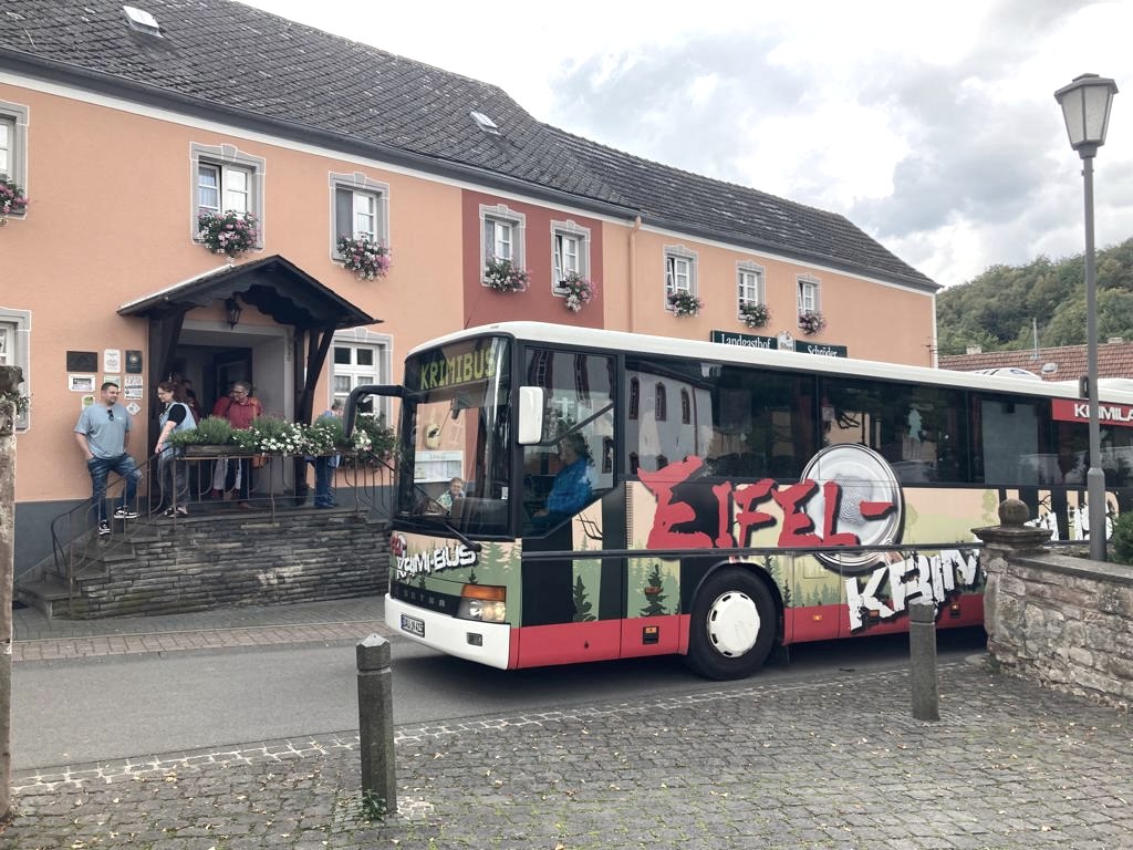 Gleich drei Veranstaltungen warteten am Samstag auf die Krimifans: Vormittags startete die Tour mit dem Krimibus auf den Spuren von Jacques Berndorf, der als Vater der Eifelkrimis grundlegend zum großen Erfolg der Krimilandschaft Eifel beigetragen hat. Der bekannte Schauspieler und Sprecher Josef Tratnik führte an die Schauplätze aus Berndorfs Büchern, trug prägnante und spannende Romanpassagen vor und gab dabei interessante Einblicke in die Welt der Eifelkrimis. Die Bustour war schon Wochen im Voraus restlos ausverkauft.