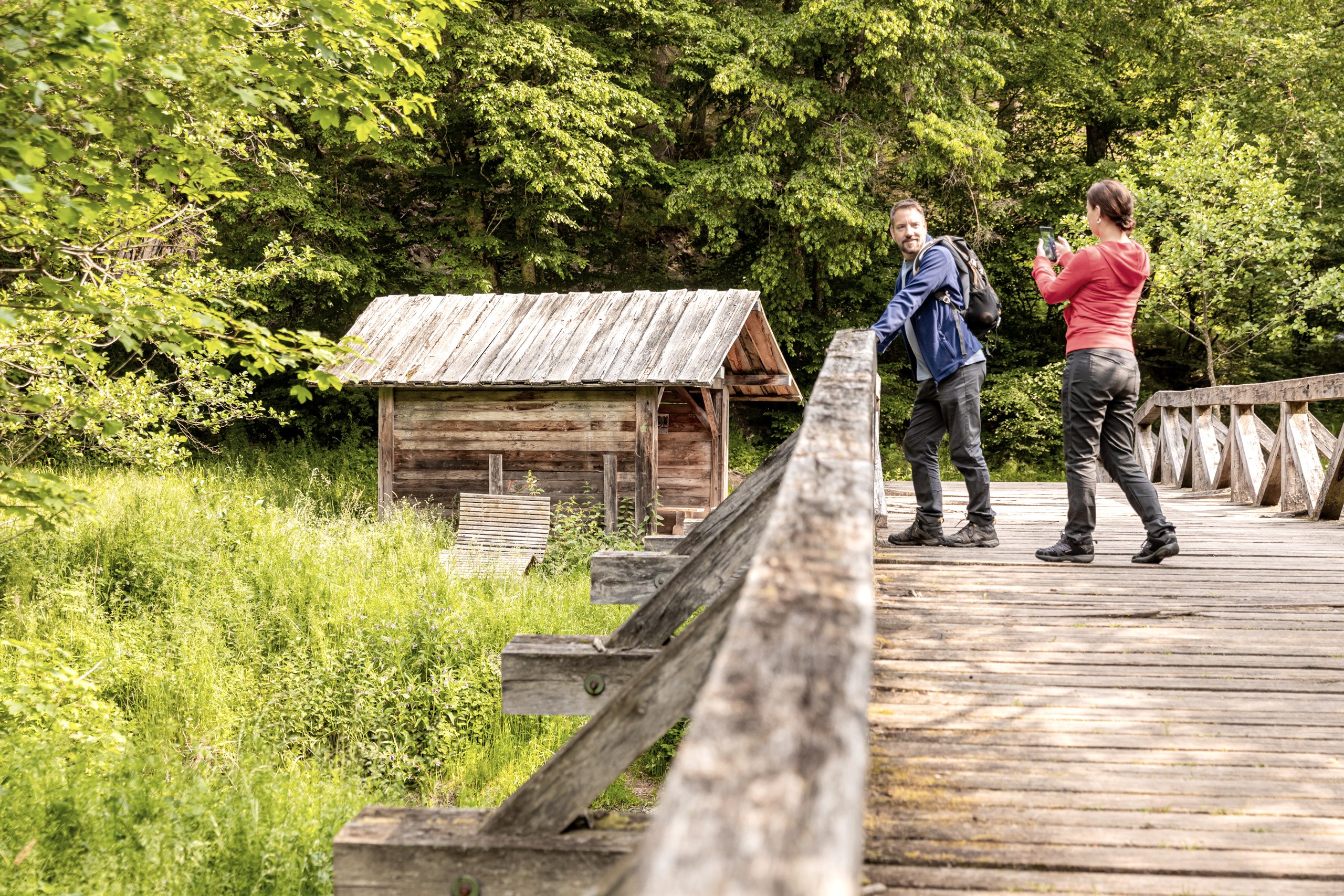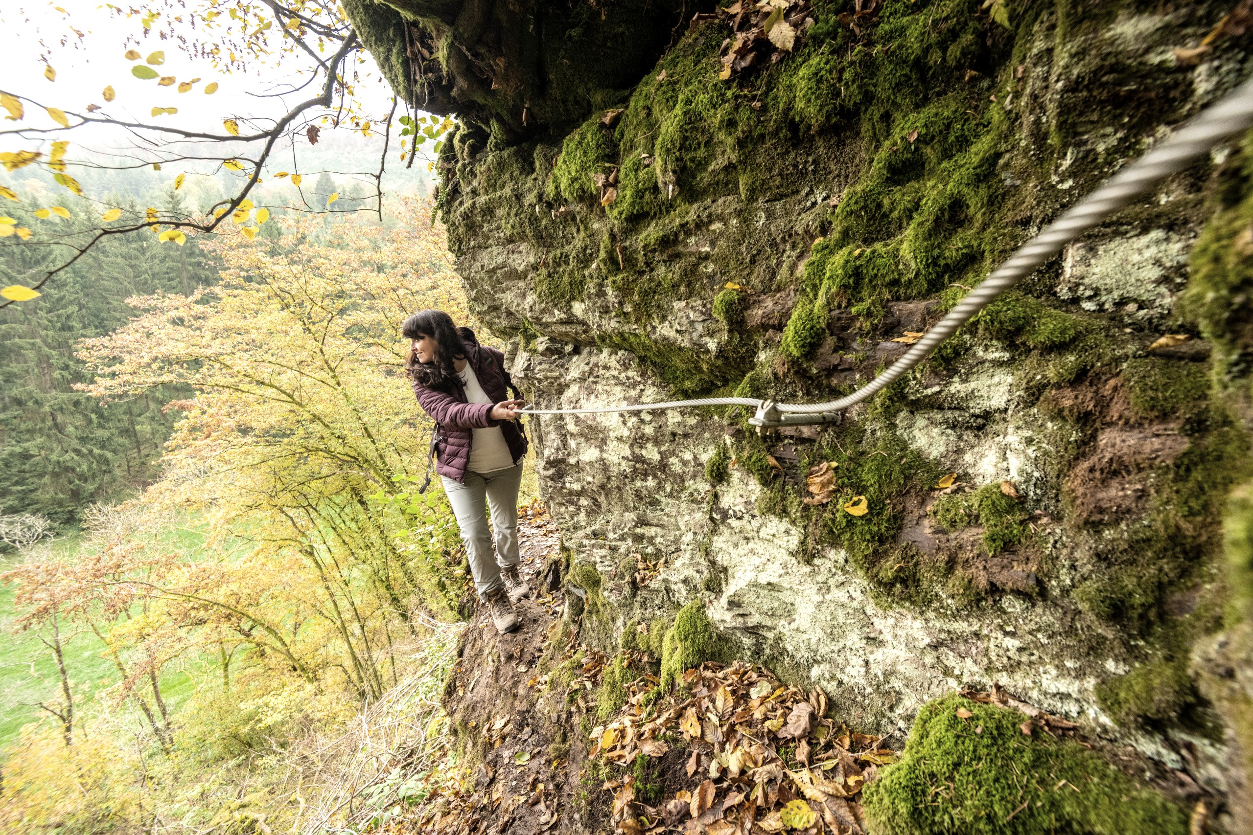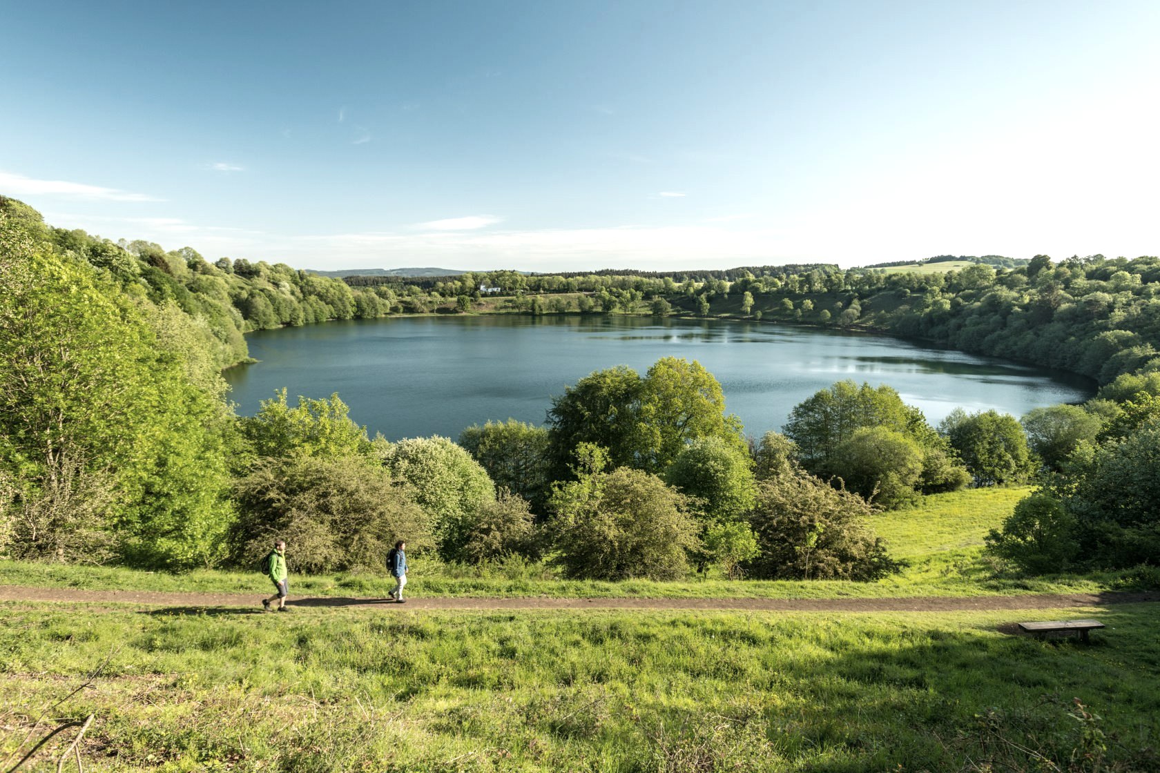 Today, your hike starts out gently along the first few metres through the Kurpark in Daun. But you soon realise that the landscape here must have had a fiery past. There is a particular atmosphere here, mystical and powerful. Step by step, you hike up to the first elevation and see something glittering between the trees. It is Gemündener Maar - a volcanic lake. You just know something dramatic must have happened here! Mighty explosions and fire from the earth’s interior blew holes in the earth and piled up mountains here in the Eifel. The holes are called “Maare” and some have filled up with water over time. How still and dark the water is, and fascinating too. You continue uphill to the summit of the crater’s edge and discover another Maar, Weinfelder Maar (also called Totenmaar). Up here, you will find the stone Dronketurm and can climb the steps to the viewing tower with ease. You allow your gaze to wander over the vibrant landscape of the volcanic Eifel. What an amazing feeling! But then you hear something: did anyone notice that? Yes! On the Weinfelder Maar meadows, goats are used as landscapers. Along a narrow path it’s downhill again to the Schalkenmehrener Maar, with the village of the same name on its banks. All three lakes together are also called Dauner Maare. After Schalkenmehren the hike leads you into the green valley of the Lieser. The picturesque little river ripples down to the valley. You share the valley with nature alone, listening to the birds singing and the gentle sound of the water. The long valley accompanies you to your stage destination in the castle town of Manderscheid. Just before Manderscheid, you follow the rocky path and catch a first glimpse of the Manderscheid Upper Castle.
