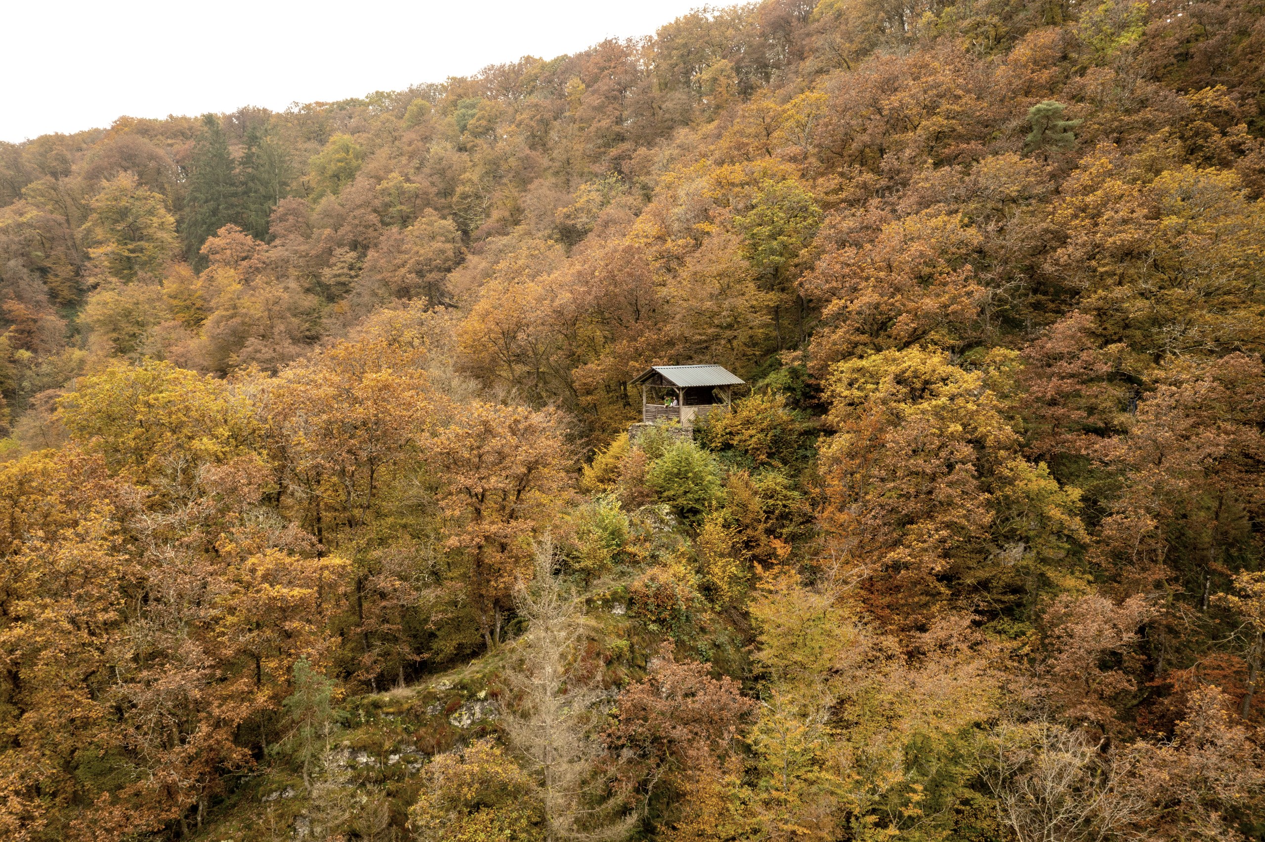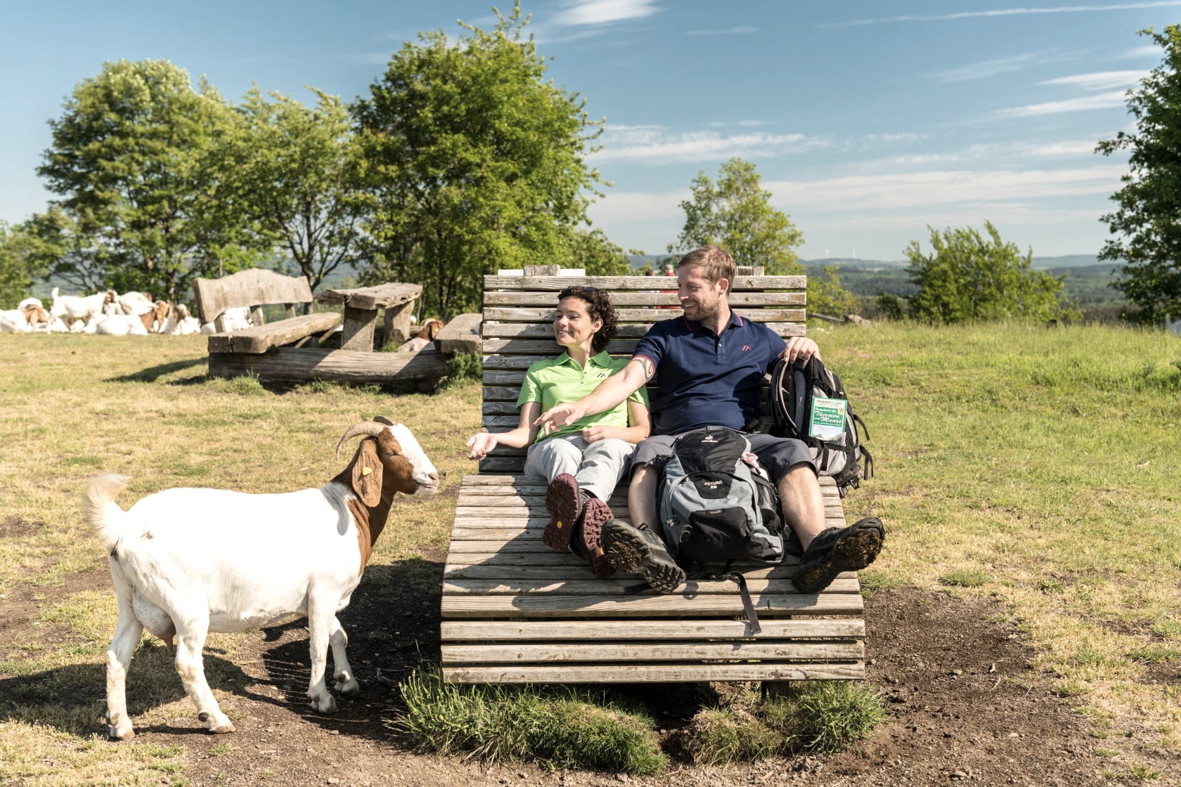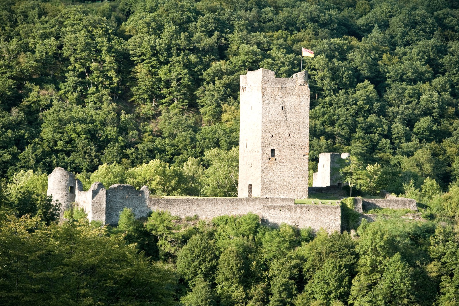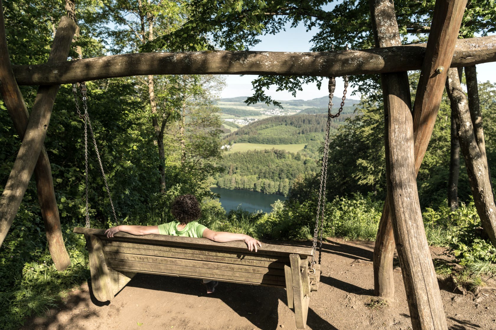 Today, your hike starts out gently along the first few metres through the Kurpark in Daun. But you soon realise that the landscape here must have had a fiery past. There is a particular atmosphere here, mystical and powerful. Step by step, you hike up to the first elevation and see something glittering between the trees. It is Gemündener Maar - a volcanic lake. You just know something dramatic must have happened here! Mighty explosions and fire from the earth’s interior blew holes in the earth and piled up mountains here in the Eifel. The holes are called “Maare” and some have filled up with water over time. How still and dark the water is, and fascinating too. You continue uphill to the summit of the crater’s edge and discover another Maar, Weinfelder Maar (also called Totenmaar). Up here, you will find the stone Dronketurm and can climb the steps to the viewing tower with ease. You allow your gaze to wander over the vibrant landscape of the volcanic Eifel. What an amazing feeling! But then you hear something: did anyone notice that? Yes! On the Weinfelder Maar meadows, goats are used as landscapers. Along a narrow path it’s downhill again to the Schalkenmehrener Maar, with the village of the same name on its banks. All three lakes together are also called Dauner Maare. After Schalkenmehren the hike leads you into the green valley of the Lieser. The picturesque little river ripples down to the valley. You share the valley with nature alone, listening to the birds singing and the gentle sound of the water. The long valley accompanies you to your stage destination in the castle town of Manderscheid. Just before Manderscheid, you follow the rocky path and catch a first glimpse of the Manderscheid Upper Castle.