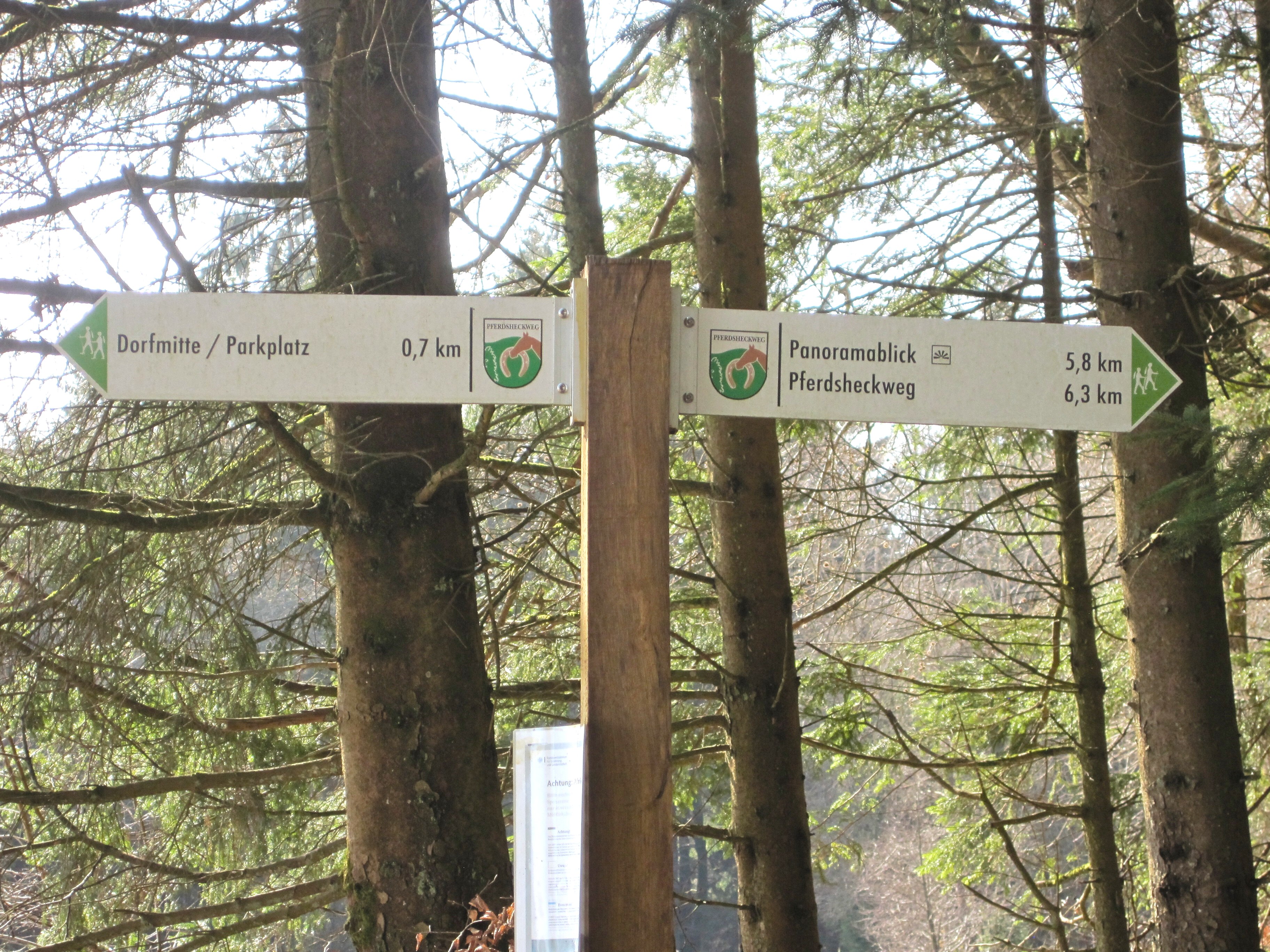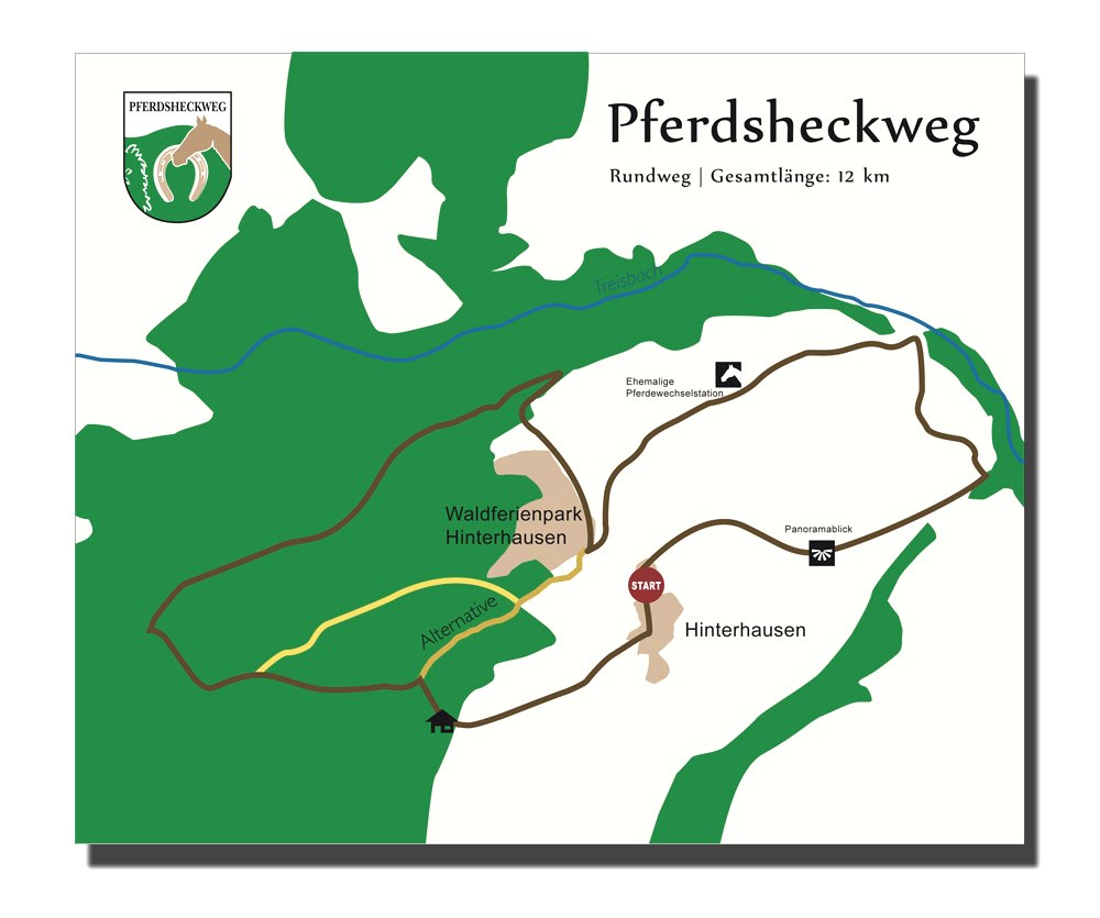 Hinterhausen is the highest village in the Gerolsteiner Land. 23 old houses are grouped in a ring around the old village centre and the small chapel. The entire village centre is now considered a cultural monument and is a listed building. From here you have a wide view over the wooded Eifel heights and the Kyll valley. Numerous hiking trails, including the signposted Pferdsheckweg, lead through the natural surroundings. The circular trail is well signposted with the "Pferdsheckweg" (Horseback Trail) emblem. The Horseback Trail alone is about 7 km long. If you add the feeder roads to the holiday park, it is about 2 km longer. First the trail leads through deep and dark Eifel forests around the Hermesberg. Then you hike back up to the holiday park and look down on the Wöllersberg volcano and Gerolstein.