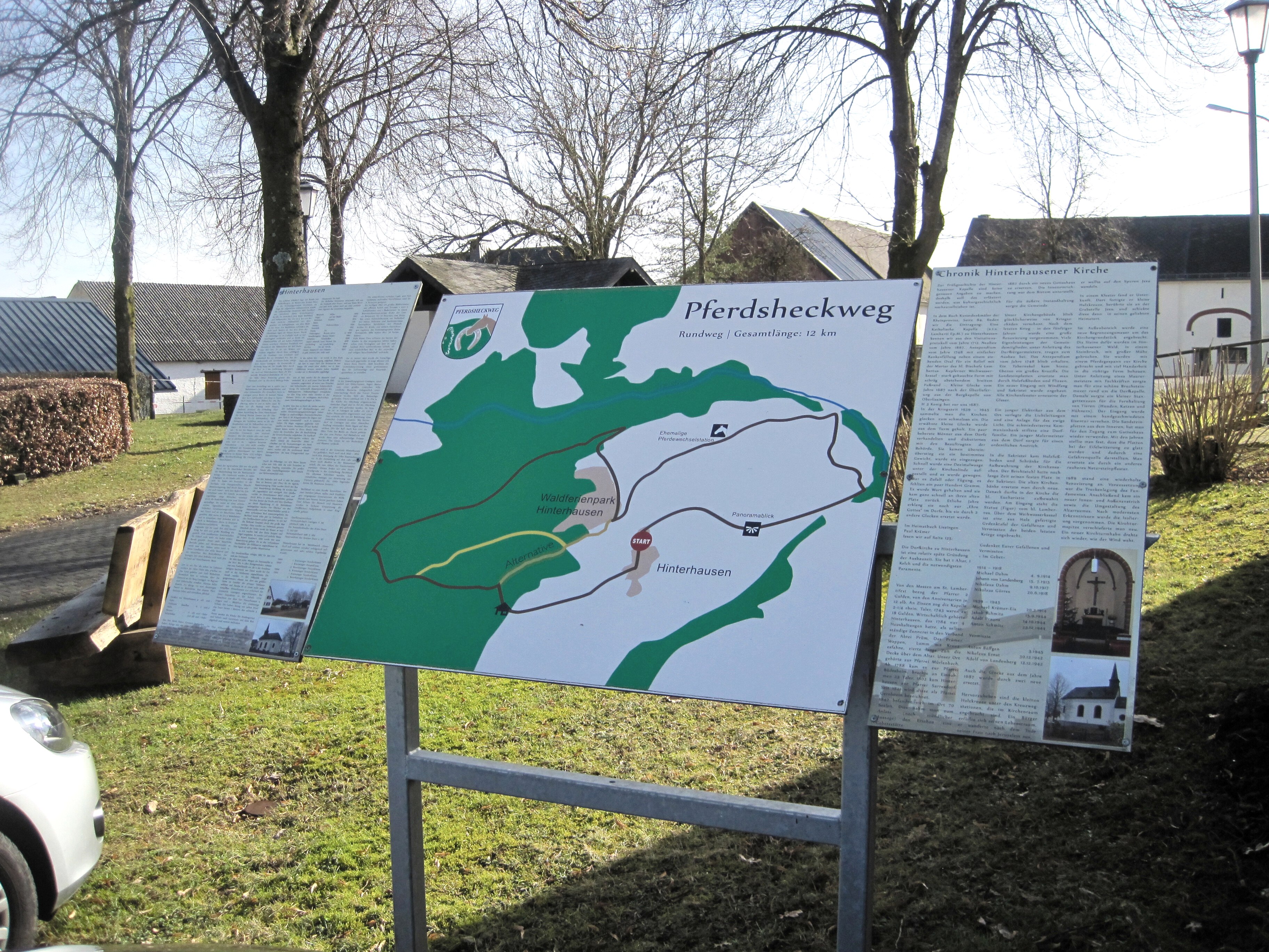 The starting point of this hike is the small chapel in the centre of Hinterhausen, a district of Gerolstein. From here, the path leads us out of the centre of the village. We walk along green meadows past the Hinterhausen rest area. We follow the path markings through old forest stands and arrive at the forest holiday park. From here we head downhill, past the information board that explains the history of the horse changing station. Uphill, we reach the spot that opens up a magnificent panoramic view all the way to Gerolstein. We turn right onto the K31 district road, which leads us back to the starting point.