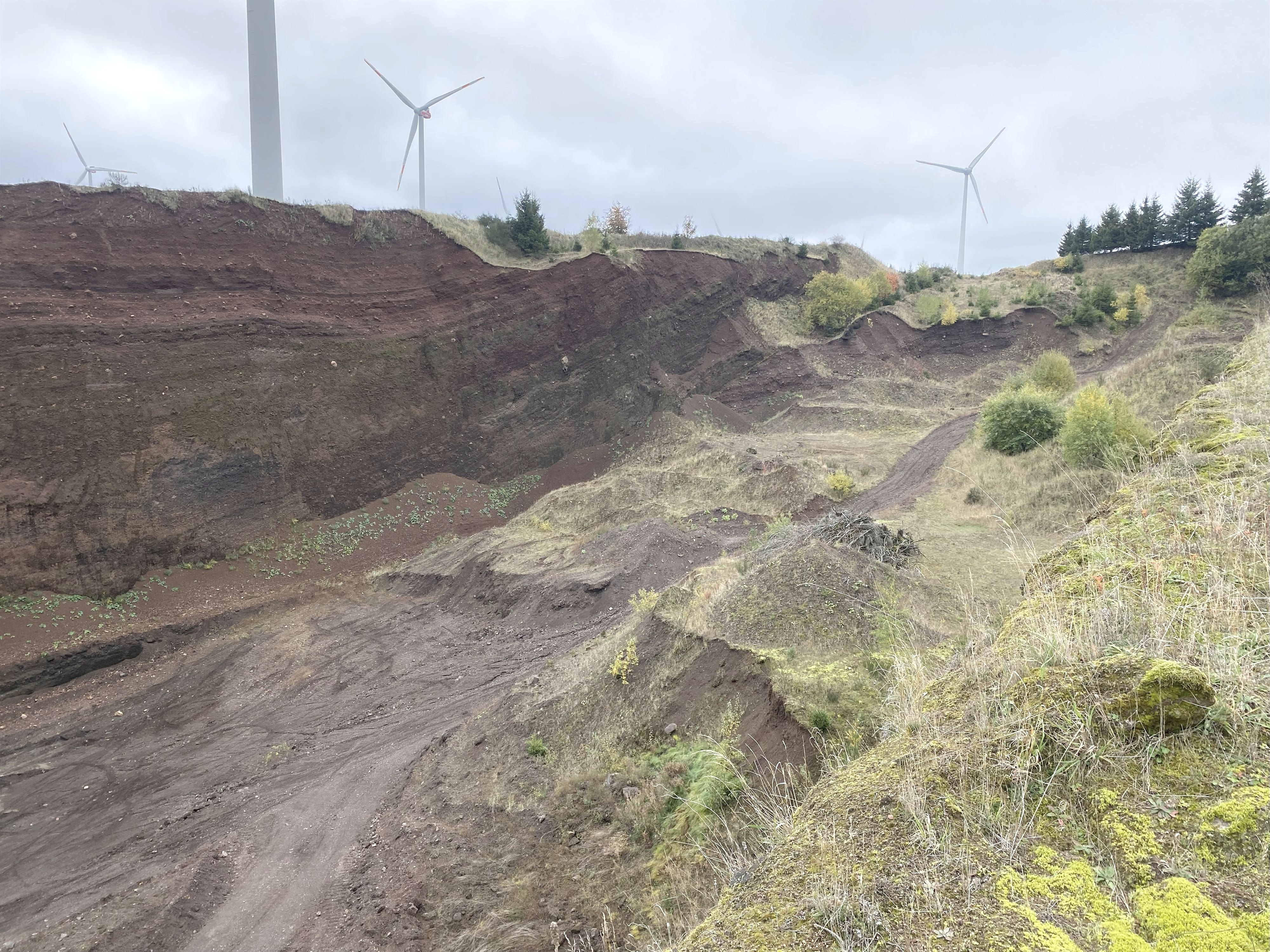 The Goldberg is located at an altitude of 649.1 meters above normal zero. The Goldberg, 1.5 km northeast of Ormont, is a volcano that was created about 10 to 11,000 years ago in two eruptions. First, a large ash cone was formed. After a short break, the second eruption phase began, which at first exploded the top of the old cinder cone with a strong explosion. Then again a cinder cone was built up on the leftovers, and after a certain time the activity ceased. The volcano was built on a plateau of the tertiary Peneplaine at about 610 m altitude. It was originally much taller than 649 meters which it had before mining. Likewise, its extent was much greater, especially to the west. The valleys were not nearly as cut as they are today. Unlike most volcanoes, the Goldberg consists not of lava but tuff. This feature is characteristic of volcanoes on the periphery of an area. The Goldberg is the westernmost point of the quaternary volcanic area in the Eifel, which extends over a width of 12 km and a length of more than 50 km from Bad Bertrich to Ormont. In the tuff we find lapilli, augite crystals, olivine, feldspar, hyalite drops and biotite. From the biotite, popularly called Katzengold, the mountain and probably also the place has its name. In 1958, a deeper arched tunnel with finished and semi-finished millstones was discovered on the northern slope of the Goldberg. The millstones of hard lava basalt were used in the tanning factories of Prüm, Neuerburg, Sankt Vith, Malmedy and Stavelot. Since the end of the 19th century, the Goldberg is mined. The sand (tuff) is an ideal road bed for road construction.