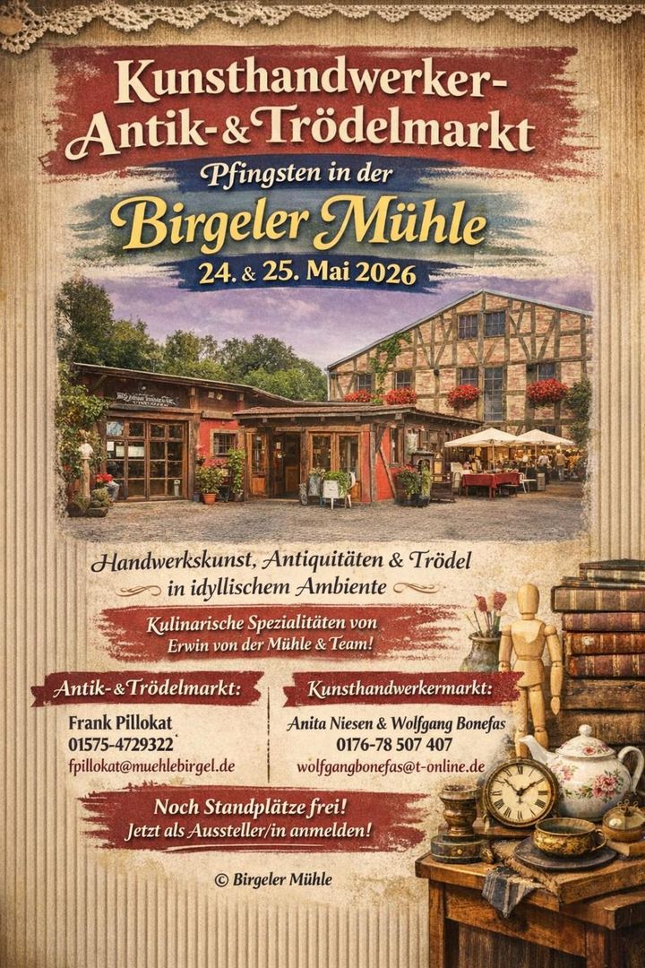An Pfingsten, 24. & 25. Mai 2026 findet in der Birgeler Mügle ein Kuntshandwerker-, Antik- & Trödelmarkt statt.Handwerkskunst, Antiquitäten & Trödel in idyllischem Ambiente. Kulinarische Spezialitäten von Erwin von der Mühle & Team Noch Standplätze frei! Jetzt als Aussteller/in anmelden. Antik- & TrödelmarktFrank Pillokat, Tel.: +49 157 54729322, Mail: fpillokat@muehlebirgel.de KuntshandwerkermarktAnita Niesen & Wolfgang Bonefas, Tel.: +49 176 78507407, Mail: wolfgangbonefas@t-online.de