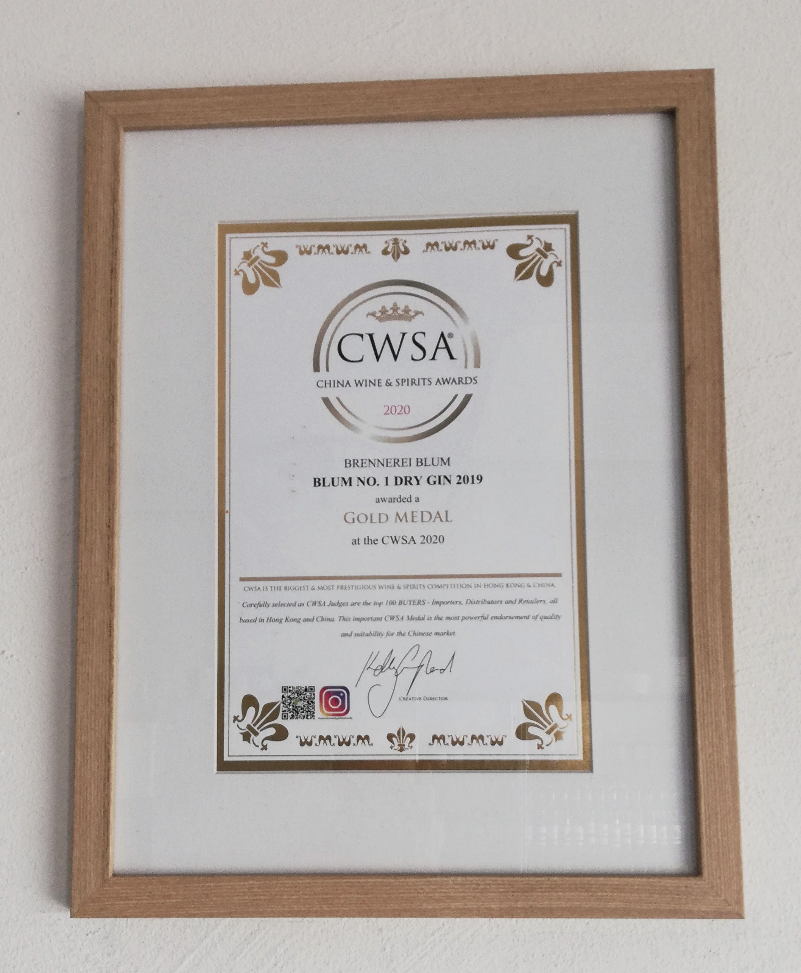 Damit die Nachfrage so bleibt, achtet Leo Blum auf strenge Qualitätskriterien und stellt sich und seine Produkte regelmäßig auf den Prüfstand. Sein Gin ist von der Deutschen Landwirtschaftsgesellschaft und der Rheinland-Pfälzischen Landwirtschaftskammer ausgezeichnet. Darüber hinaus hat er seit 2019 mehrere Gold-Prämierungen des internationalen „China Wine Spirits Awards“ erhalten.