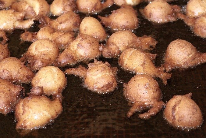 Den Teig mit Hilfe von 2 Esslöffeln wie Klöße in heißes Fett geben. Auf allen Seiten goldbraun backen, herausnehmen und abtropfen lassen.