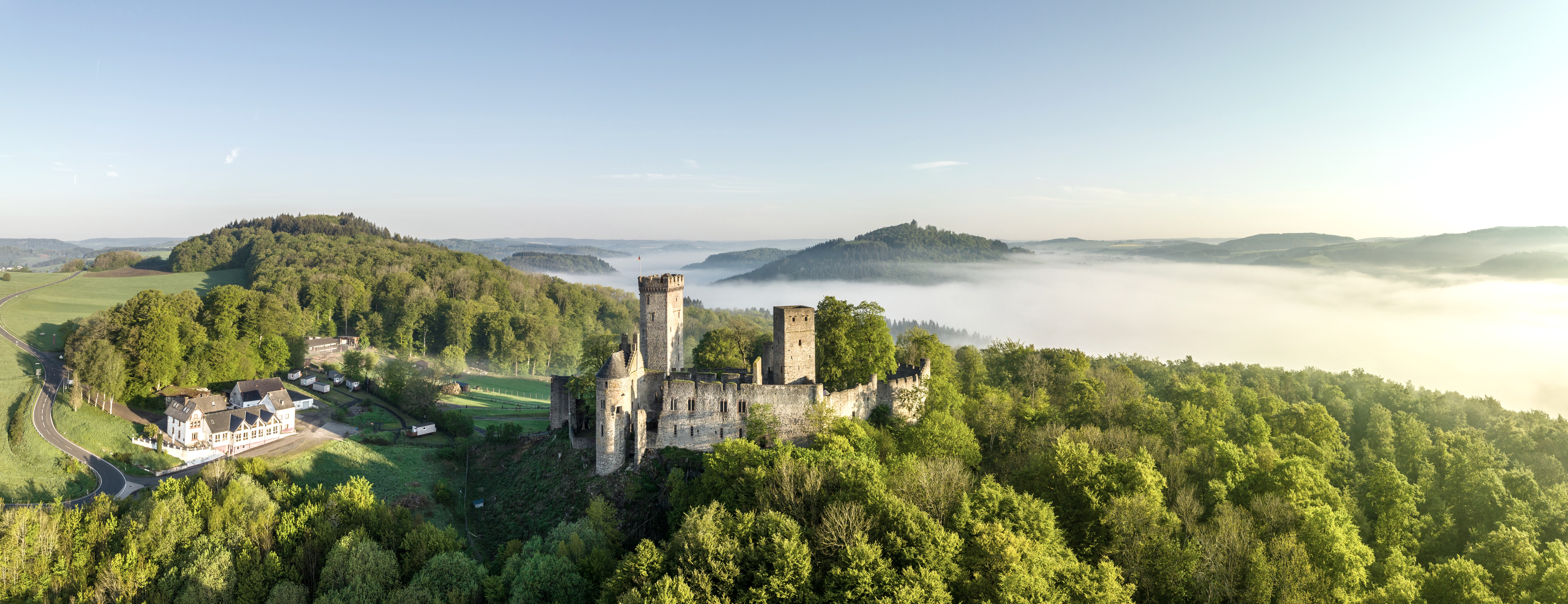 De fietstocht is in veel opzichten een feest voor de zintuigen. Het onthult duizenden jaren oude geheimen van de geologie met dichtbeboste vulkaankegels, maaren en mineraalrijke bronnen. De Helenenquelle-bron in Gerolstein is een van deze getuigenissen. Zelfs de mensen uit de oudheid en de middeleeuwen wisten hoe ze de schatten van het vulkanisme moesten gebruiken. Ze lieten mystieke rotslandschappen achter, zoals het binnenste van de vulkaan Arensberg of de ijsgrotten hoog boven Hohenfels, waar ze het basalt ontgonnen voor molenstenen. Maar ook de moderne cultuur bezorgt je kippenvel, want het misdaadhuis in Hillesheim geldt als een van de grootste verzamelingen voor fans van detectiveromans en misdaadseries. Dankzij de kracht van het water werden de hellingen en dalen van het vuurgebergte een paar kilometer verderop de idyllische uiterwaarden van het Bolsdorfer dal. De historische molen in Birgel laat zien hoe belangrijk de maalderij was voor de Eifel tot het begin van de 20e eeuw. In Steffeln, in de vulkaantuin met het Eichholzmaar, is de spectaculaire geschiedenis van de aarde weer intens voelbaar. weer intens voelbaar. Een dagtocht op de fiets kan niet afwisselender zijn. Zestig kilometer op de avontuurlijke tocht door het Gerolsteiner Land zijn de kwintessens van de Vulkaaneifel. De kroon op het werk is een omweg te voet naar de top van de Rother Kopf. Hier heb je vrij uitzicht op een prachtig Eifelpanorama - en er wacht ook een ijsgrot om verkend te worden.