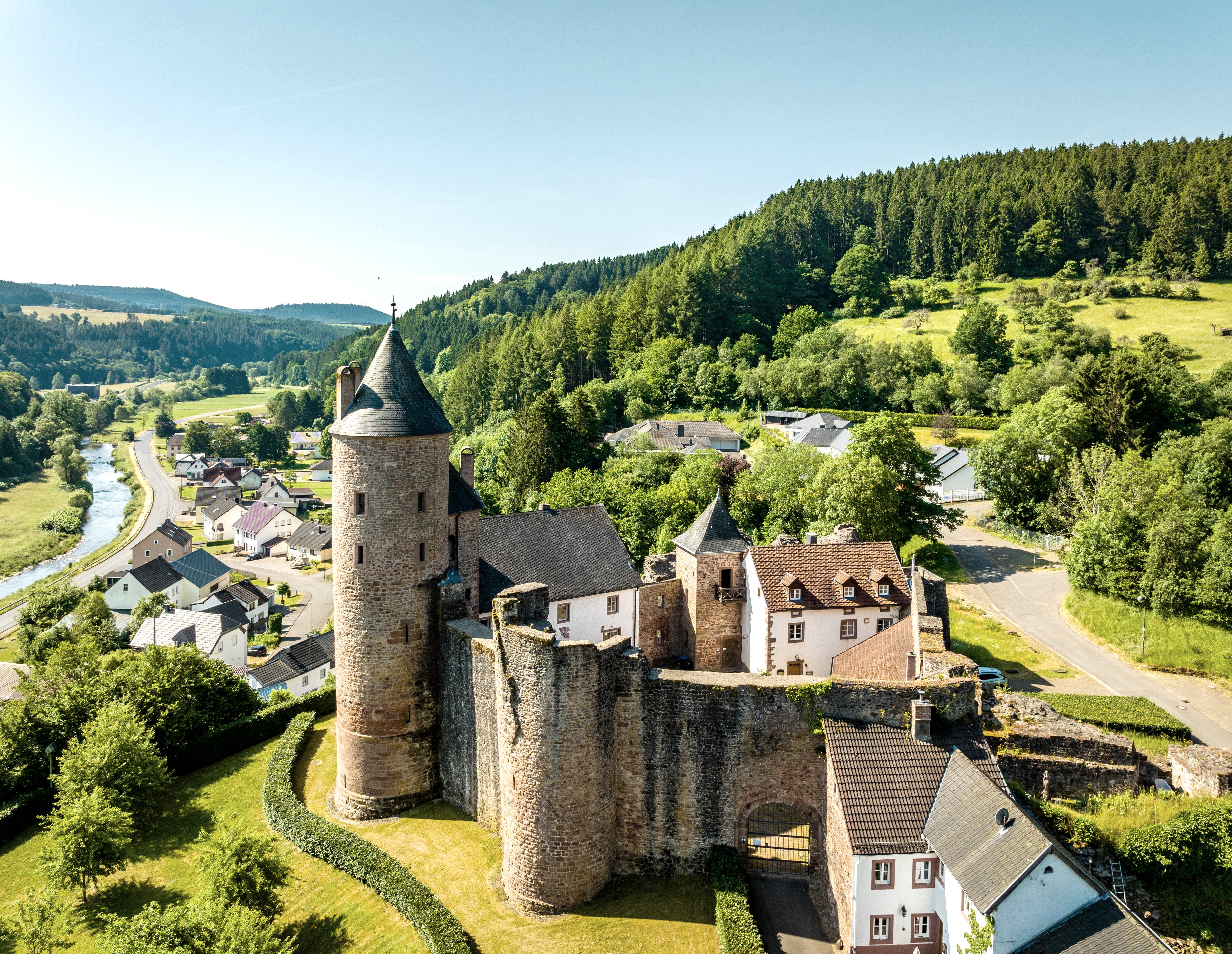 De dubbele toren van de Bertradaburg steekt uit boven de Eifelstad Mürlenbach en is de naam van de ongeveer 13 km lange gevarieerde rondweg. De Bertrada-route biedt een combinatie van natuur, cultuur en geologie. Van Birresborn langs de indrukwekkende ijs- en molensteengrotten, naar Adam en Eva, oude dennen met een stamomtrek van 3 meter, naar Mürlenbach naar de Bertradaburg en weer terug naar Birresborn.
