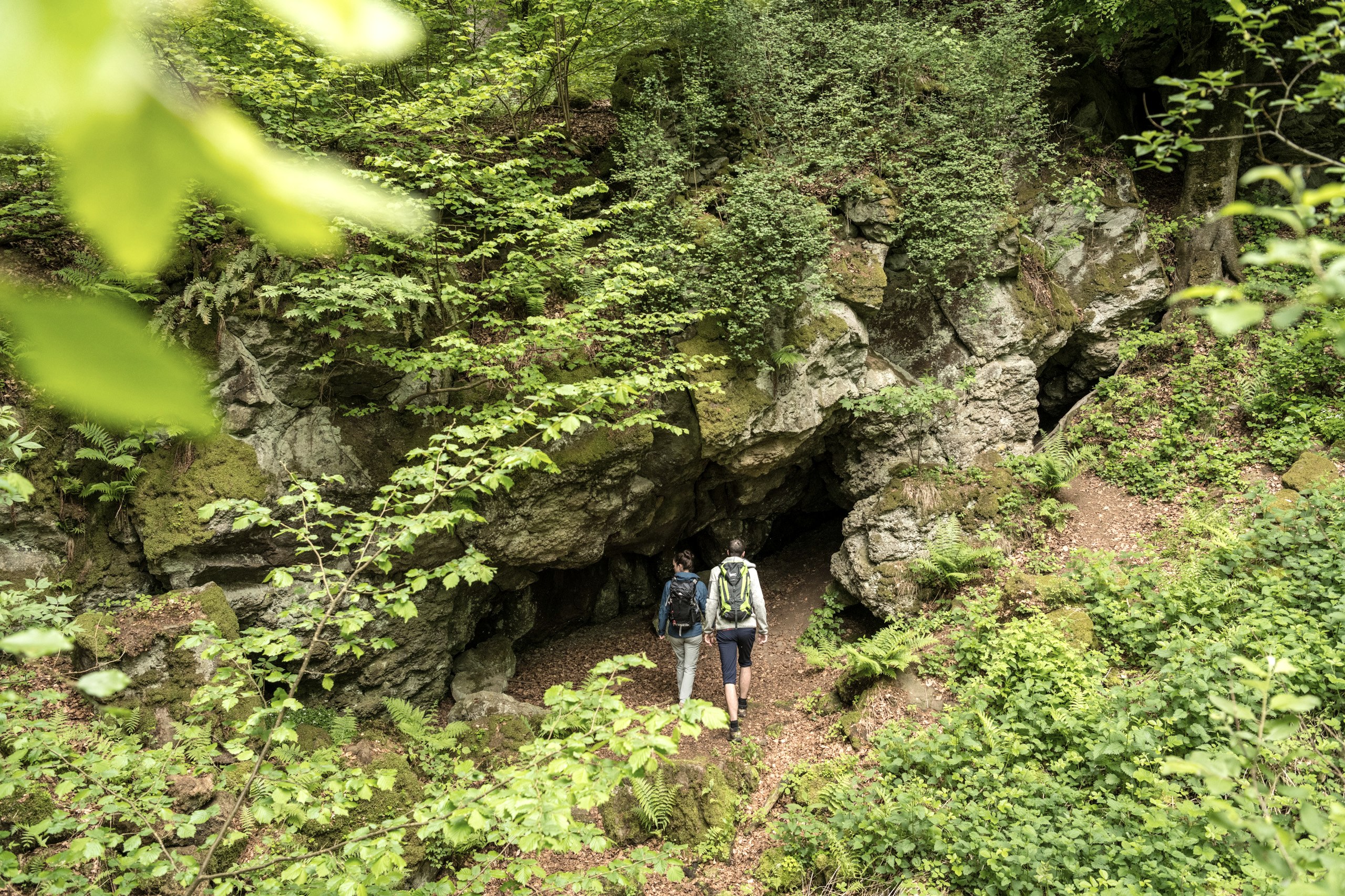 Je kunt tot rust komen aan de groene rand van Gerolstein. Start en finish is bij het stuwmeer van Gerolstein, dat we in noordelijke richting verlaten. We volgen de wegwijzers bergopwaarts door uitgestrekte velden en kleine bospercelen, langs het Heimatpfad met zijn gigantische geologische klok. Tussen Müllenborn en Roth rijst de vulkaankegel Rother Kopf met een indrukwekkende hoogte van 566 meter uit het landschap op. Dit is een typische basaltvulkaan uit de Eifel. Het poreuze, slakkige basalt was van de Romeinse tijd tot in de 19e eeuw de beste grondstof voor de productie van molenstenen. De molenstenen werden gedolven in ondergrondse gangen en vandaag de dag "kleven" er nog steeds veel molenstenen aan de wanden van de grot. Lange tijd werden deze ook gebruikt als "ijsgrotten"; op het congres van Aken in 1818 zogen de prinsen en bisschoppen op het ijs van de Rothgrot! De koele, allergeenvrije lucht in de grot is een zegen op warme zomerdagen, geniet van het "grotsanatorium in het klein"! De molensteen- en ijsgrotten van de Rother Kopf kunnen het hele jaar door worden bezocht. Als je een zaklamp bij je hebt, kun je jezelf onderdompelen in de grotten en een adembenemende sfeer ervaren.