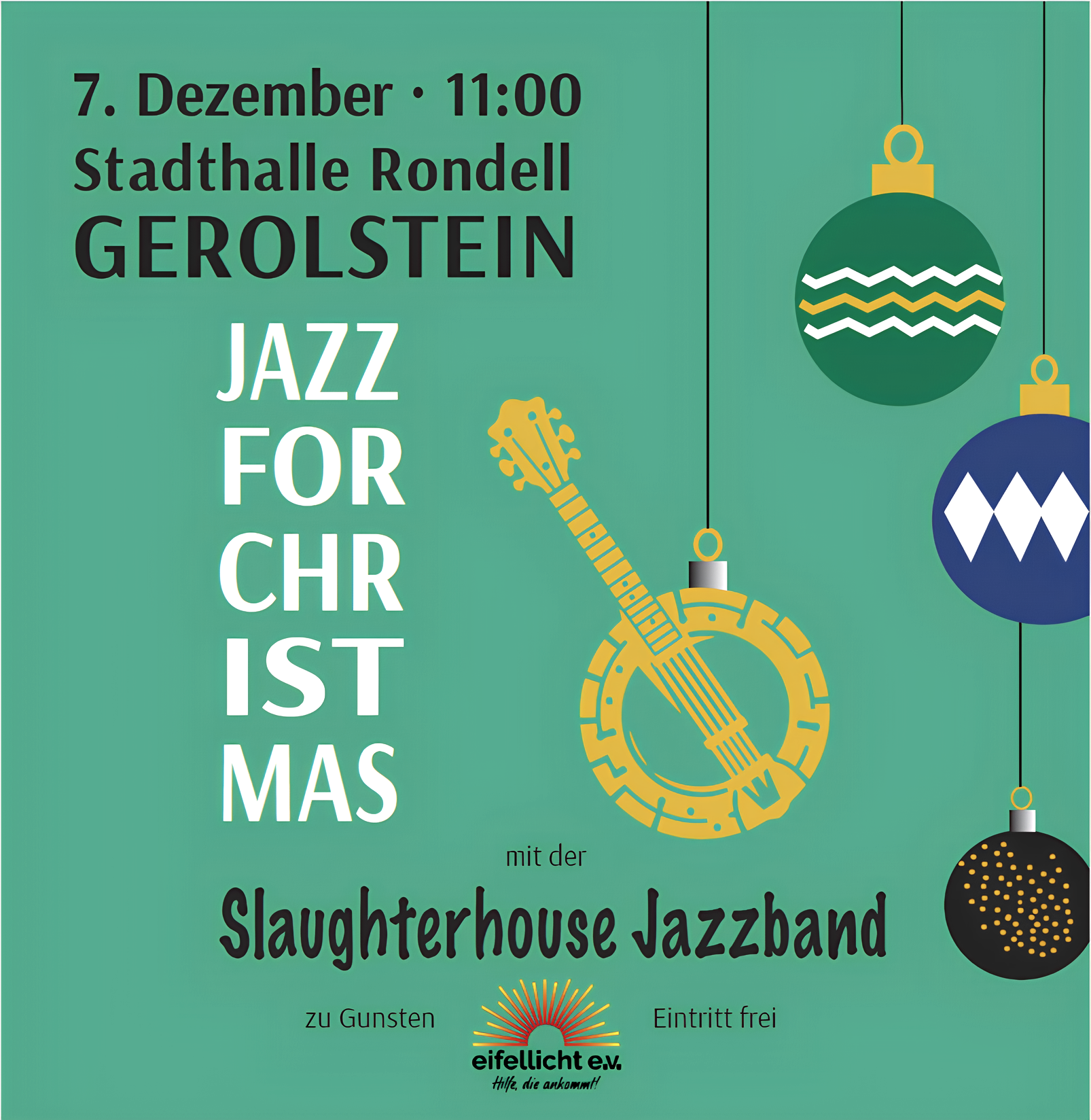Op 7 december 2025 verandert de Stadthalle Rondell in Gerolstein in een plek vol swingende kerstklanken. De Slaughterhouse Jazzband nodigt uit voor een bijzonder concert: Jazz For Christmas – een concert dat niet alleen muzikaal verblijdt, maar ook voor een goed doel dient. De opbrengst komt ten goede aan de vereniging eifellicht e.V.