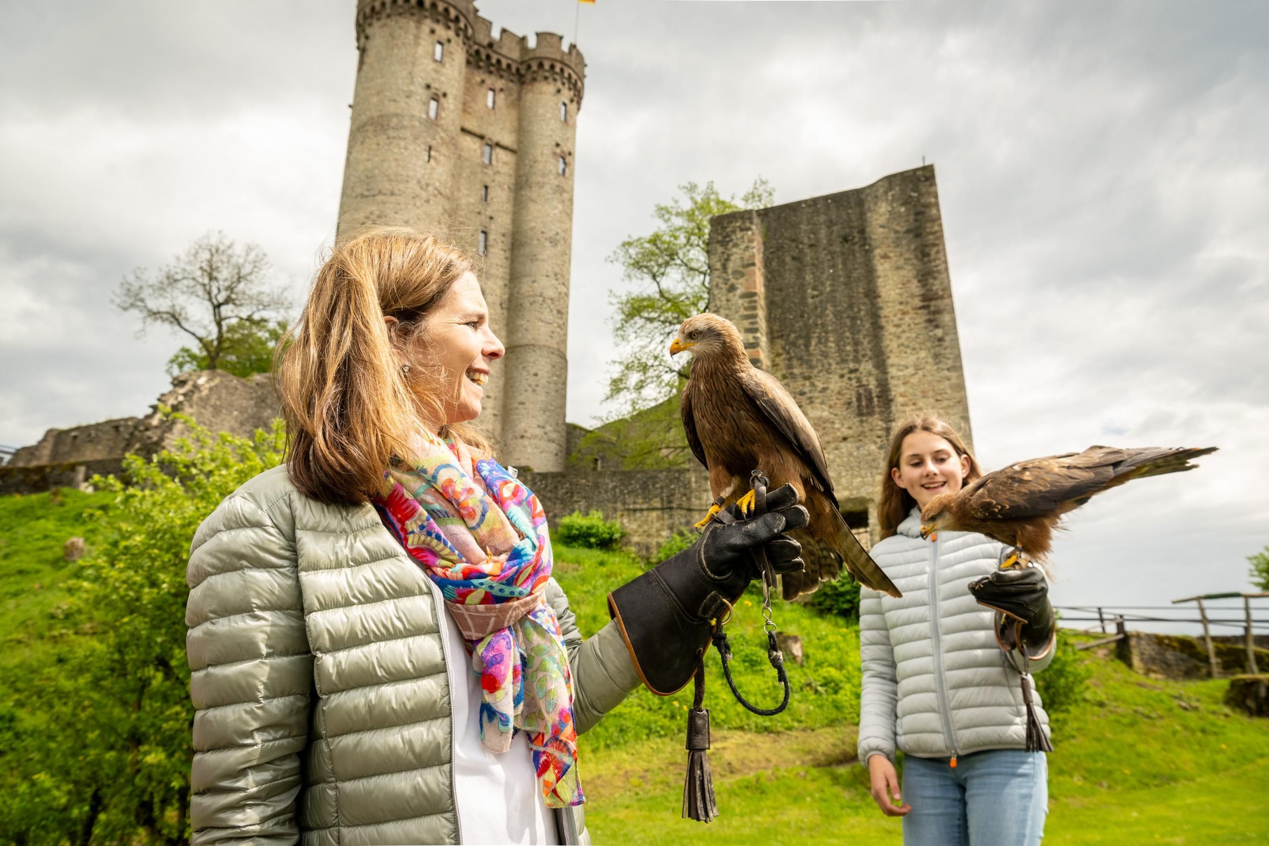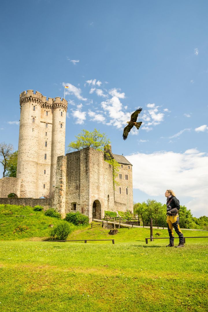 Hoch über dem Eifel-Flüsschen Kyll und auf einem senkrecht aufragenden Massiv aus Dolomitgestein und Basalt thront die Kasselburg. Unverwechselbar wird sie durch einen imposanten Doppelwohnturm, der die aus dem 12. Jahrhundert stammende Burganlage weithin sichtbar zum Markenzeichen des Gerolsteiner Landes macht. Die gut erhaltene Ruine lässt nicht nur das Herz großer und kleiner Mittelalterfans höher schlagen, sie birgt auch ein tierisch spannendes Geheimnis. Denn sie beherbergt den Adler- und Wolfspark Kasselburg mit vielen majestätischen Greifvögeln, die ihre Luftakrobatik in Flugshows zeigen, und mit dem größten, auf zehn Hektar Wald- und Felsgelände halbwild lebenden Wolfsrudel Westeuropas.