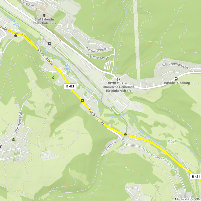 Besichtigen Sie im Anschluss am besten auch die alte Römerstraße. Im nahen Dahlemer Wald ist sie als ca. 2,5 m hoher Damm mit einer Breite von 7 -10 m noch gut sichtbar. Es gibt einen kleinen Platzbereich mit Sitzecke, Zugang über einen Bohlensteg und eine große Informationstafel. Dazu fahren Sie von Jünkerath aus ins benachbarte Esch, dort biegen Sie in die Dahlemer Straße ein und folgen dem Straßenverlauf circa 1,5 km.