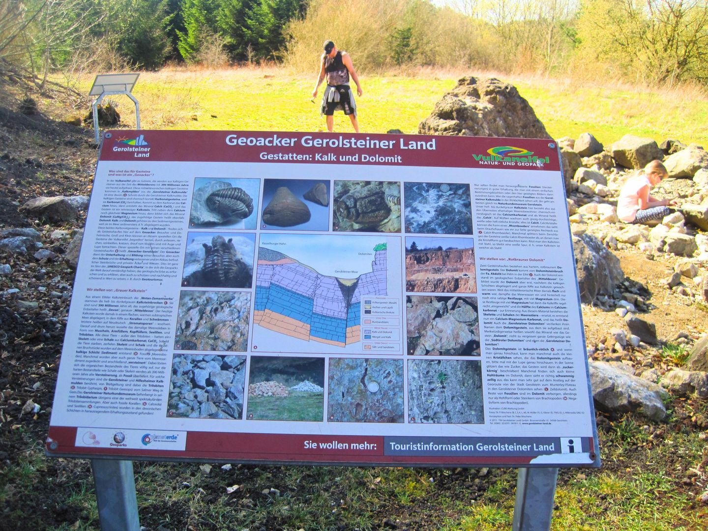 Auf dem Geoacker wurden die vier Hauptgesteinsarten der Vulkaneifel: Basalt, Kalk, Buntsandstein und Dolomit aus aktiven Steinbrüchen in der Region zusammengetragen, um Kindern hier eine Möglichkeit zu bieten, nach Herzenslust durch Hämmern, Zerbröseln und/oder Auseinanderbrechen die verschiedenen Gesteine kennenzulernen.