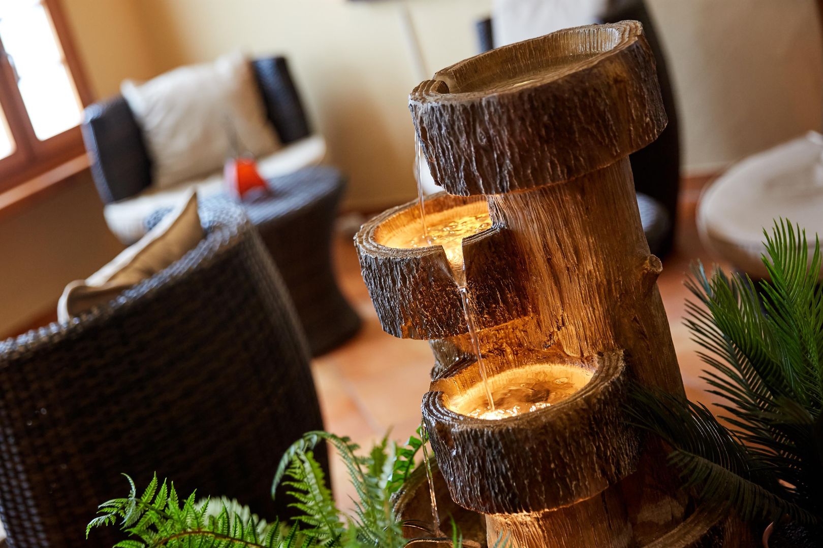 Die Wände unserer Salzgrotte bestehen aus hinterleuchteten Salzbrocken und der Boden ist mit Salzziegeln bedeckt. Das Ganze ist eingerahmt von einem Ständerwerk und Planken aus uraltem, naturbelassenem Eichenholz und bietet eine entspannende und einzigartige Atmosphäre.
