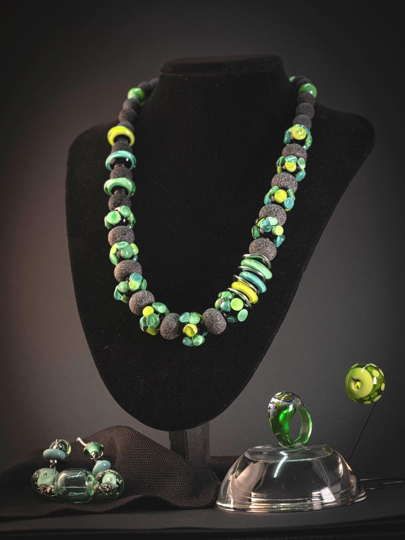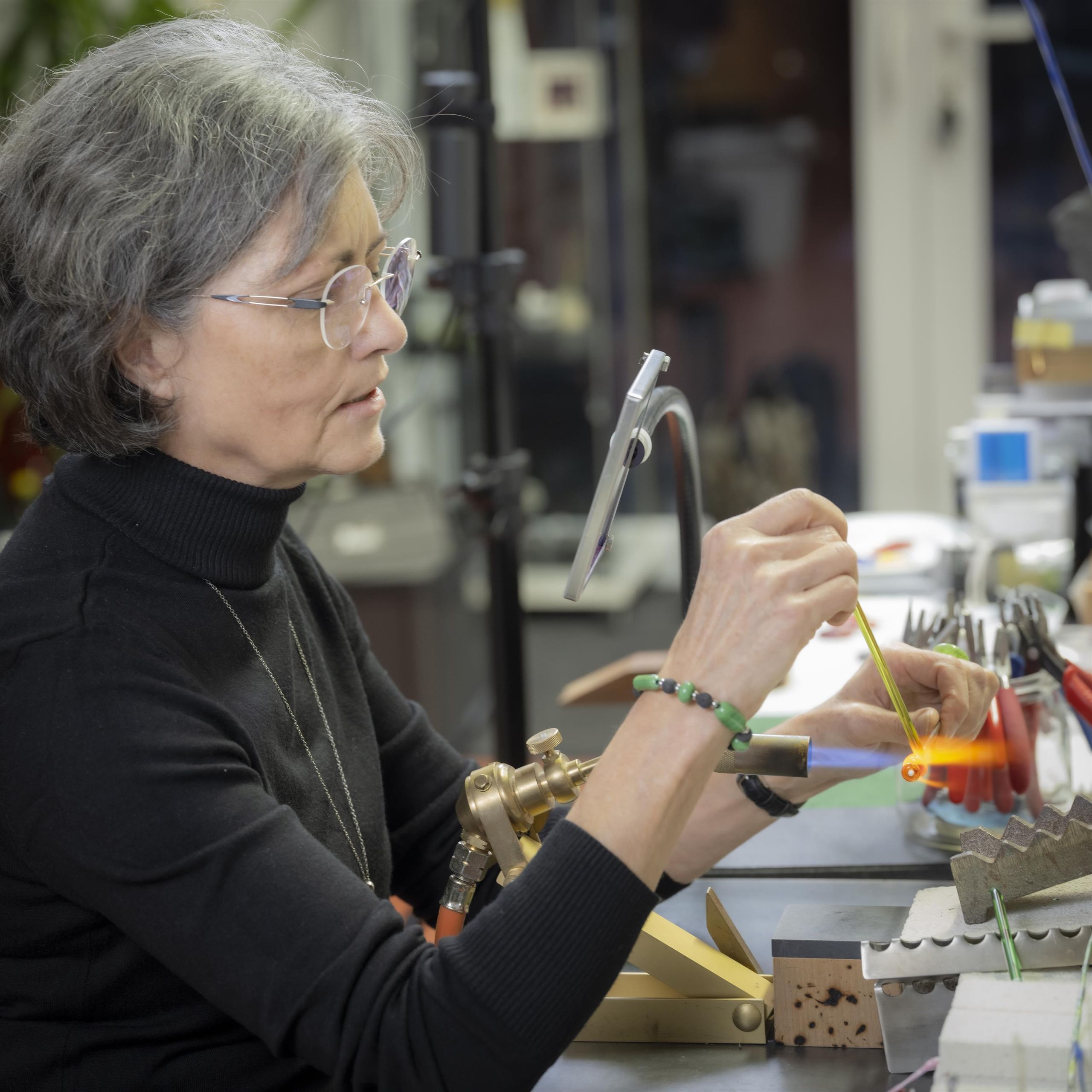 Aus venezianischem Glas schafft sie hier kleine Schönheiten, die sich als Souvenir, Beigabe, Glücksbringer oder als Hingucker an Ohr, Hals oder Arm eignen.
