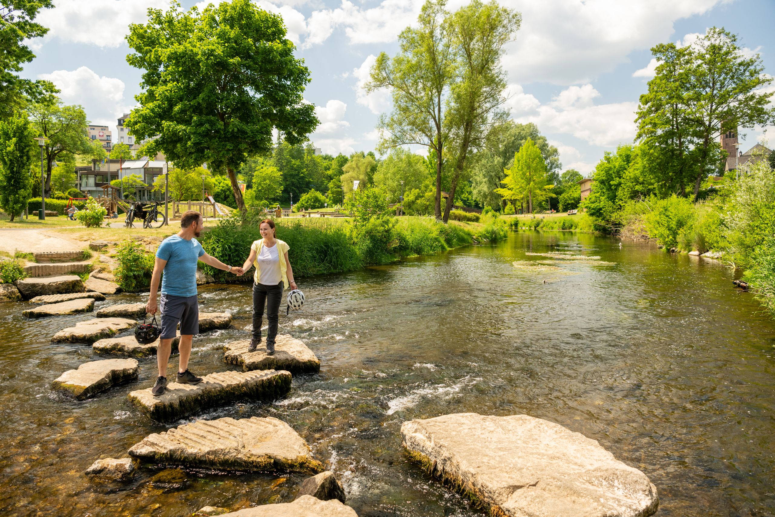 Die Helenenquelle am Kyll Radweg beim Gerolsteiner Rathaus ist ein beliebter Rastplatz für Radfahrer und Wanderer. Das frische Mineralwasser kommt aus einer Tiefe von rd. 90 m und kann kostenlos von April-Oktober vom Messinghahn getrunken werden. Hier lohnt es sich eine Pause einzulegen und der Park eignet sich hervorragend für ein kleines Picknick in der Natur.