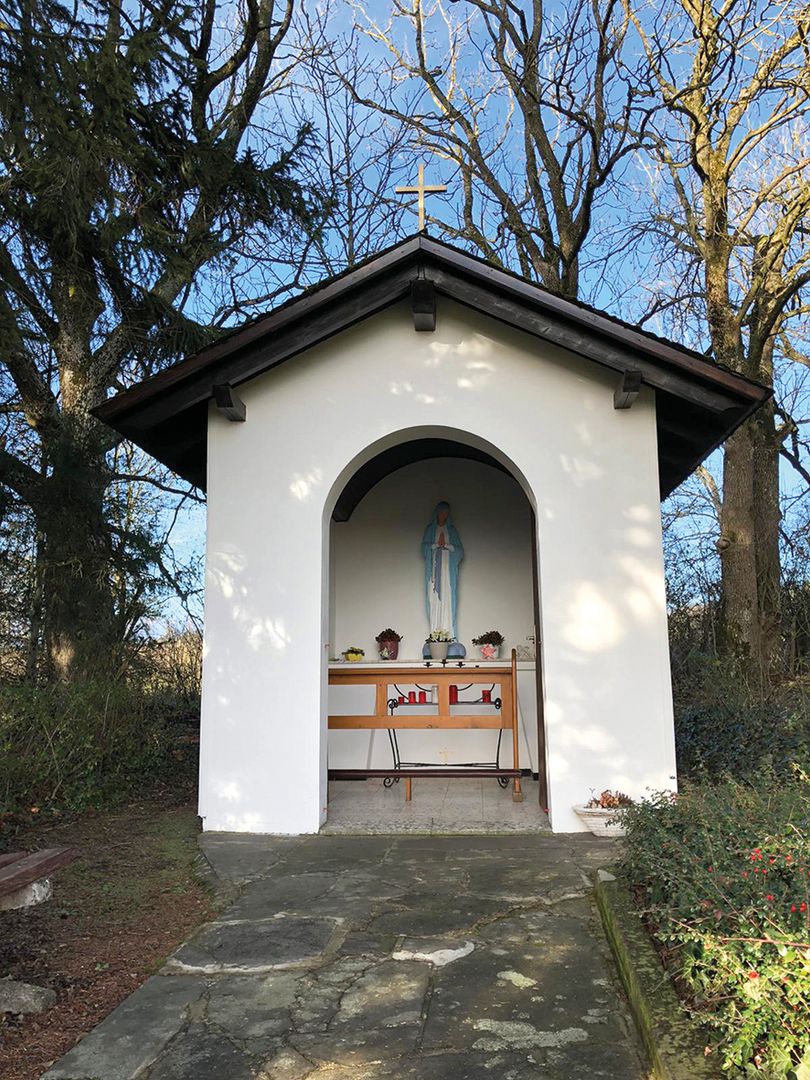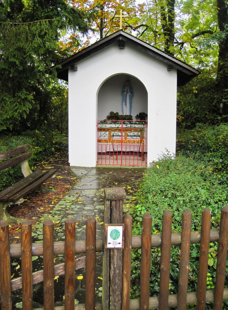 Von hier zeigt sich ein schöner Blick über den ganzen Ort mit seinen beiden Kirchen. Weiter führt der Weg nun hinab zum "Ablasskreuz", bevor er sich um den Bubberg herum ansteigend seinem Ziel nähert. Auf der Höhe angelangt kann der Wanderer sich noch einen Abstecher in die Wehrkirche gestatten.