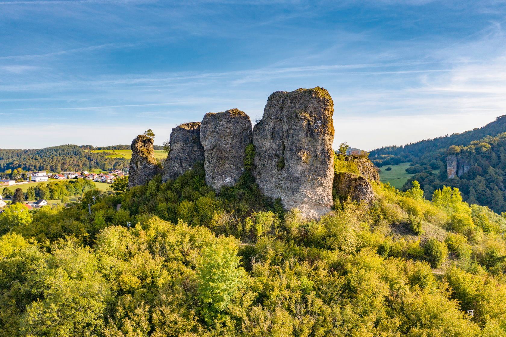 Am Start Deiner Wanderung in der Krimistadt Hillesheim fühlst Du Dich gleich ein wenig erhaben, denn Du stehst auf der historischen Stadtmauer von Hillesheim. Von dort hast Du einen wunderbaren Blick über die Stadt und in die Eifel-Landschaft. Kurze Zeit später begrüßt Dich das idyllische Bolsdorfer Tälchen mit seinem See, Kalksteinfelsen und dem Hillesheimer Bach der sich durch Wiesen schlängelt. Durch offene Landschaft wanderst Du nun weiter bis Du den Fluss Kyll überquerst und Dich dann Schritt für Schritt berghoch schraubst. An einem Treppengeländer im lichten Wald bleibt Dein Blick hängen - wohin führt diese Treppe? Du bist neugierig und steigst die Stufen hinab. Ein kalter Lufthauch strömt Dir entgegen und um Dich herum wird es dunkler. Du befindest Dich in einer der Mühlsteinhöhlen bei Roth. Sie entstanden durch den Abbau von Mühlsteinen mitten aus dem Vulkan Rother Kopf. Im Wald außerhalb der Höhle kannst Du sogar noch einen nicht fertig gestellten Mühlstein entdecken. Am Gipfel angekommen breitet sich unter Dir ein Blick ins Innere des Vulkans aus: Du schaust in einen Lava-Steinbruch. Vom Rother Kopf bietet sich Dir auch eine weite Aussicht in die hügelige Eifel, perfekt für eine Pause bevor es leicht bergab weiter zum Stausee Gerolstein geht. Du widerstehst der Versuchung, schon hier zum Etappenziel Gerolstein abzubiegen. Nun wird es richtig spannend: Nach der Vulkanlandschaft liegen jetzt die beeindruckenden Felsen der Gerolsteiner Dolomiten vor Dir. Einstmals (vor ca. 390 Mio. Jahren im Unterdevon) war hier ein warmes Meer! Hättest Du das gedacht? Die Dolomiten sind ein ehemaliges Korallenriff. Lass einfach Deiner Fantasie freien Lauf und Du wirst es erkennen.