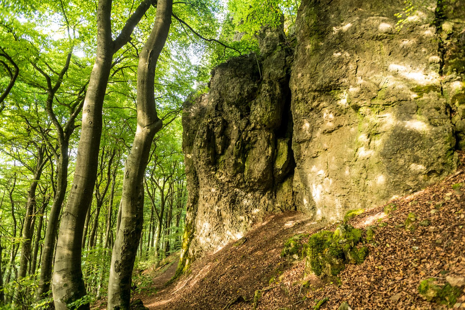 Weiter geht es durch einen Wald wie aus einem Märchen, über Treppen aus Baumwurzeln, entlang meterhoher Felswände mit Moos in allen Schattierungen und alten Buchen zur Buchenlochhöhle. Eine steile Holztreppe führt zu ihr hinauf. Sie ist 30 Meter lang und bis zu vier Meter hoch. Bereits Neandertaler nutzten sie als Unterschlupf.