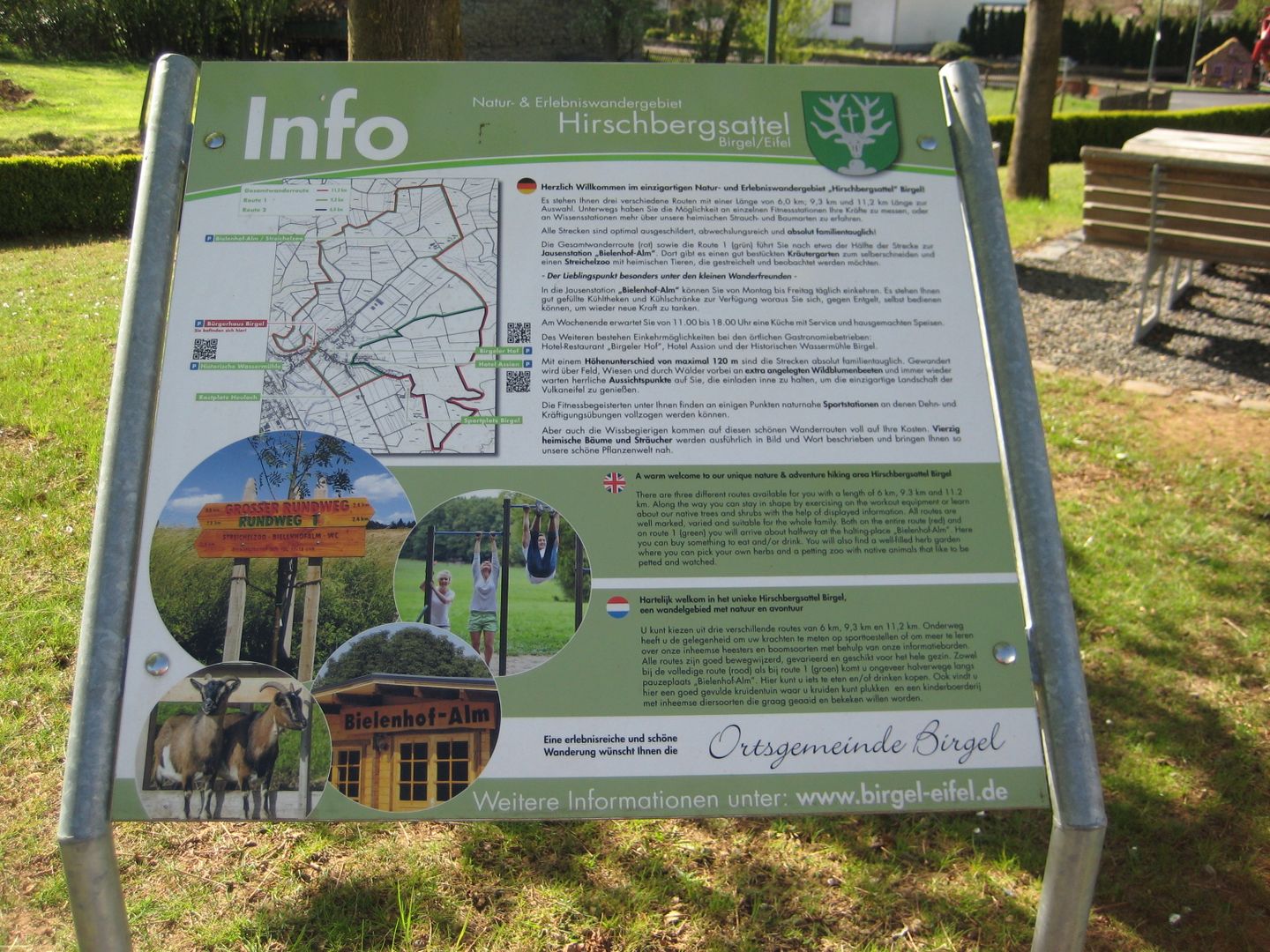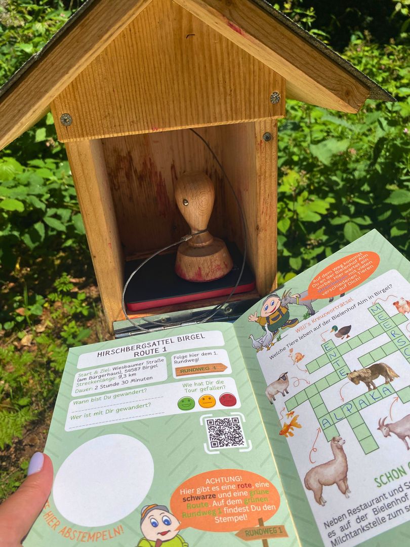 Im Natur- und Erlebniswandergebiet Hirschsattel stehen Ihnen insgesamt drei unterschiedlich lange Touren zur Verfügung. Bei der mittleren Tour (grün) über 9.3 km erwandert man die Höhen rund um Birgel. An fast jeder Biegung hat man einen anderen Ausblick auf unsere schöne Eifellandschaft. Für die sportlichen Wanderer gibt es verschiedene Angebote die körperliche Fitness zu überprüfen, während der Naturliebhaber seine Kenntnisse über die einheimischen Bäume auffrischen kann.
