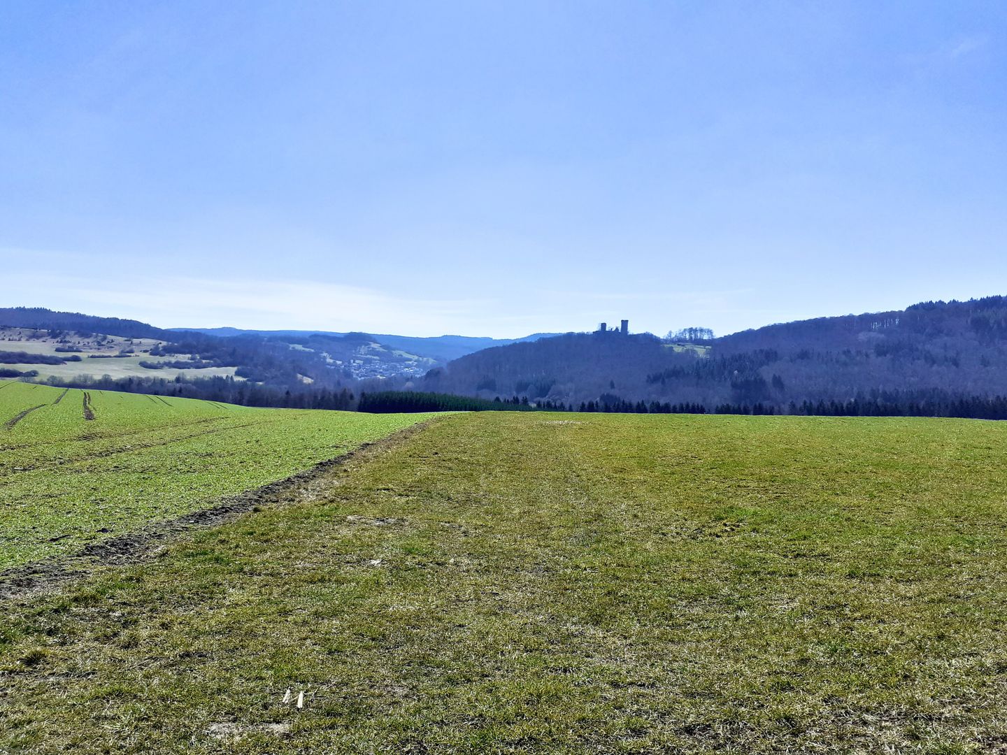 Startpunkt der Rundwanderung ist der Parkplatz im Ortskern von 54570 Rockeskyll. Wir gehen die Dorfstraße hinauf vorbei am örtlichen Sportplatz. Dahinter machen wir einen großen Bogen vorbei am Rockeskyller Kopf, der sich uns rechts vom Weg zeigt.