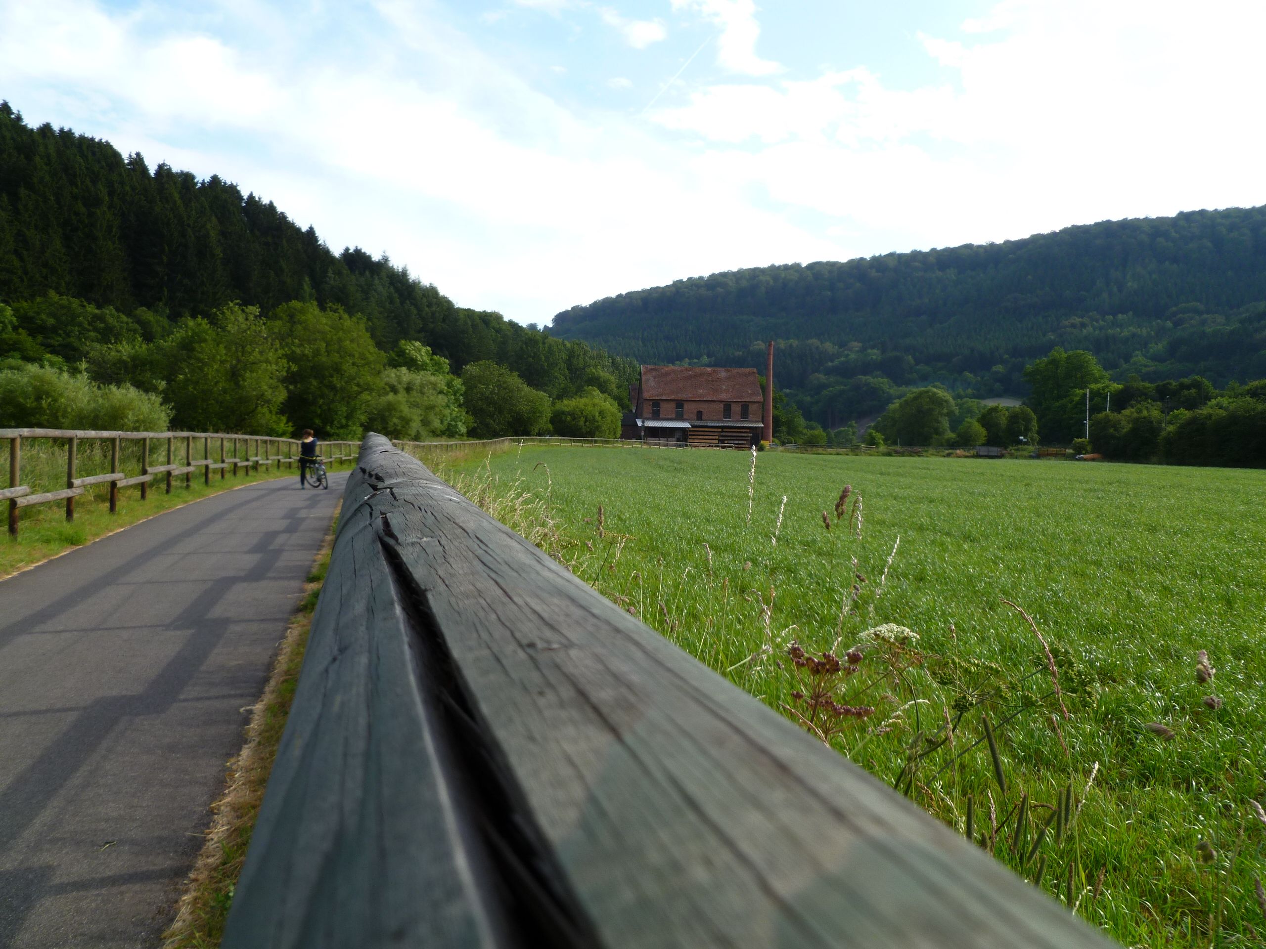 Über die Hochbrücke geht es auf den Kyll-Radweg Richtung Norden, vorbei an Dohm-Lammersdorf, einem schmucken Eifel-Dörfchen und einem ersten Tipp für eine Einkehr: im Müllich`s Hof gibt es Eifler Köstlichkeiten und selbstgebackenen Kuchen.