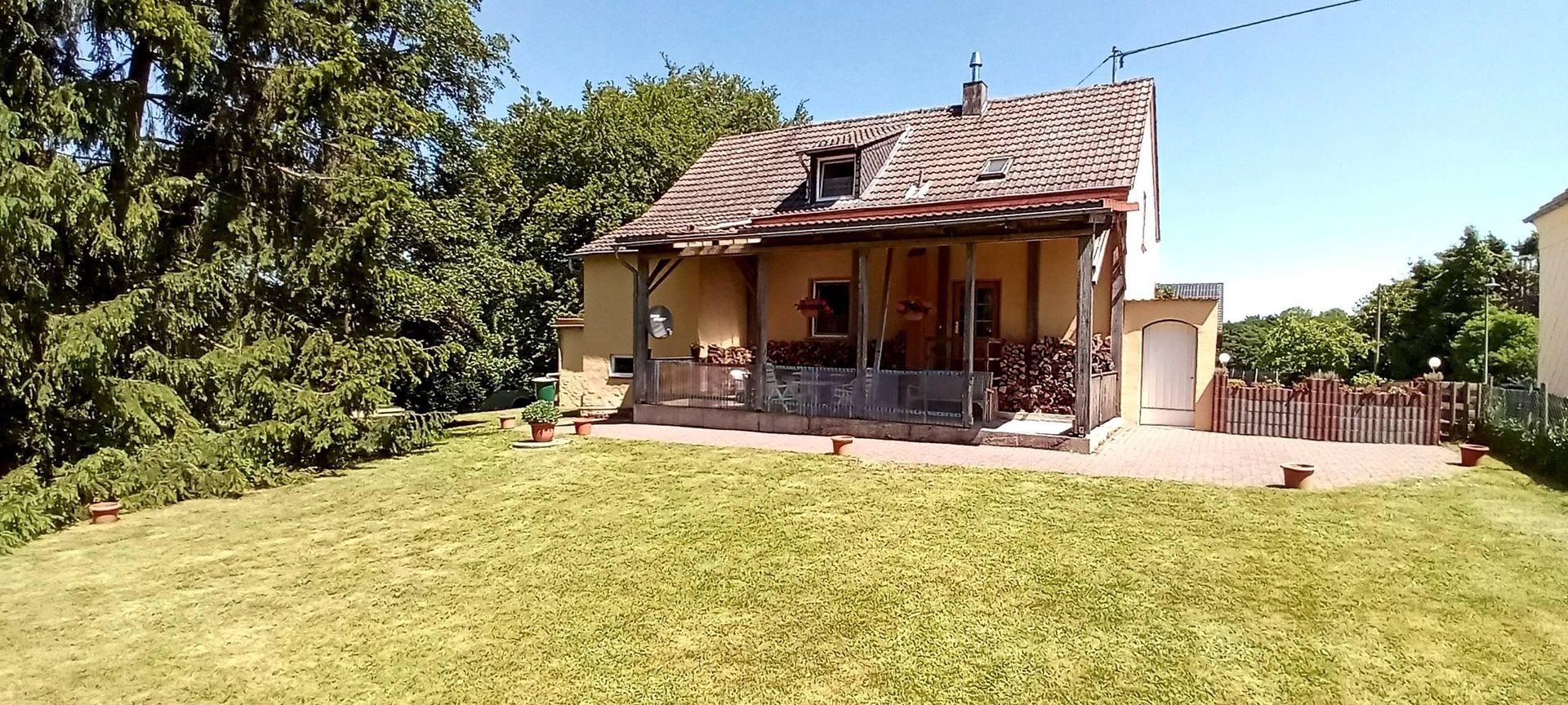 • Ein gemütliches Haus mit einem großen Garten und viel grünem Rasen. Der Raum ist von Bäumen umgeben und hat eine sonnige Terrasse.