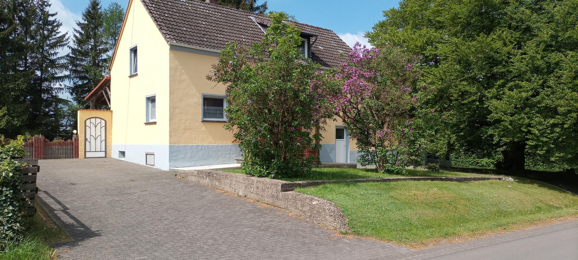 • Ein gelbes Haus umgeben von Bäumen und Sträuchern. Der gepflasterte Weg führt zur Einfahrt.