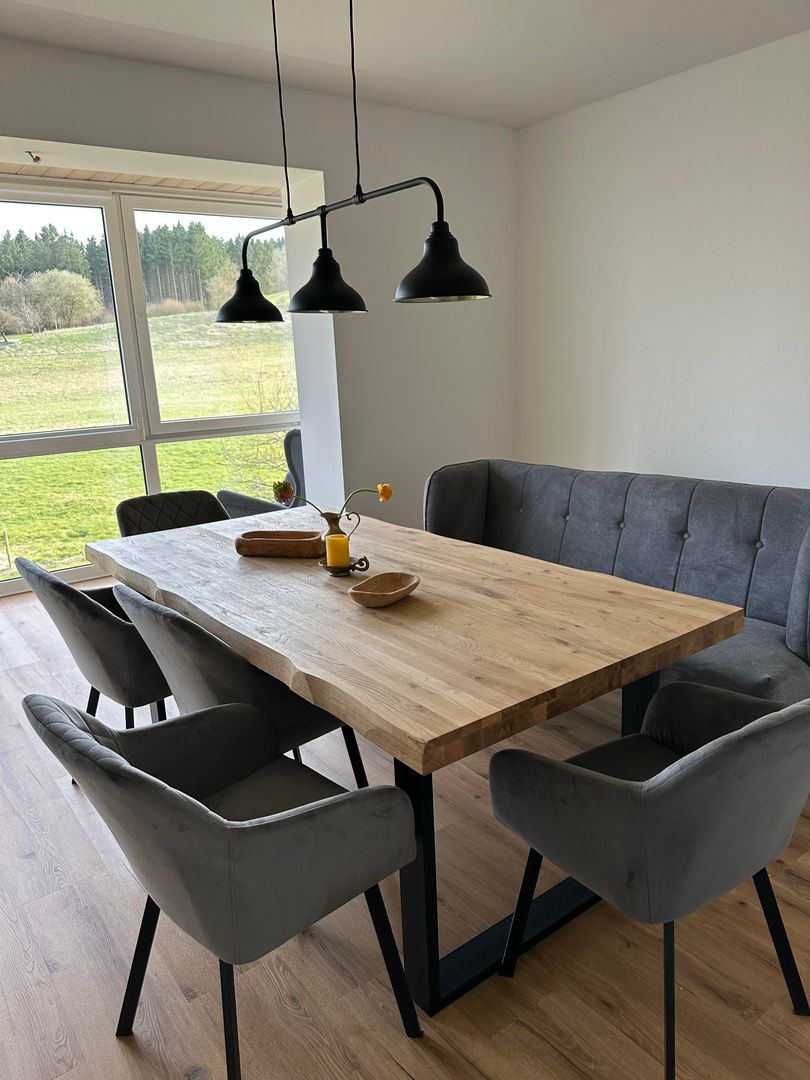 In der großzügigen Koch- und Wohnküche mit Wintergarten und großartigem Blick in die Landschaft, finden Sie einen großen Tisch mit min. 8 Sitzplätzen. Ein Hochstuhl von Stokke ist vorhanden.