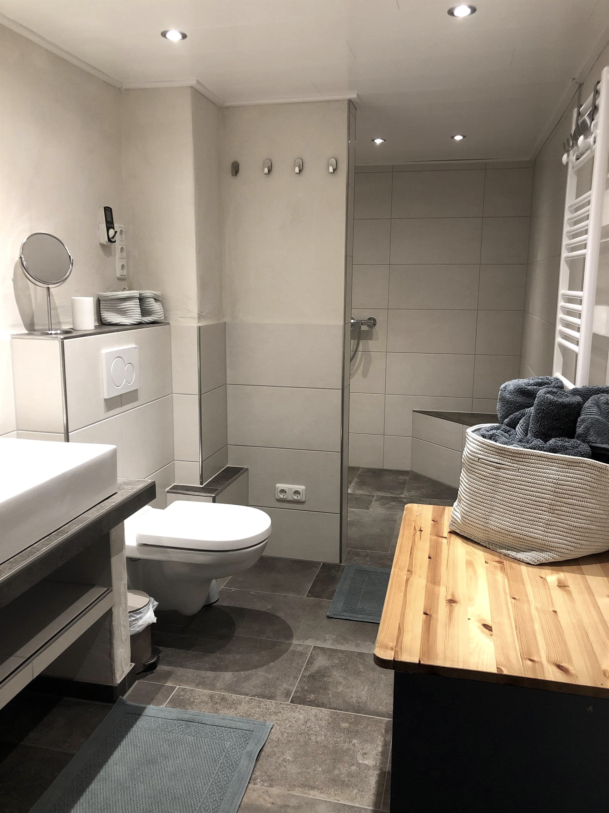 Das erst kürzlich renovierte Badezimmer ist vom Flur aus erreichbar. Es verfügt über eine große, ebenerdige Dusche mit Sitzmöglichkeit. Dem Badezimmer gegenüber befinden sich zwei kleine Schlafzimmer. Sie bieten Platz für ein 2x2m Bett (Schlafzimmer 1) bzw. ein 2x1.4m Bett (Schlafzimmer 2). In Schlafzimmer 2 befindet sich außerdem ein Kleiderschrank. Die Schlafzimmer sind nur durch eine Tür voneinander getrennt und Schlafzimmer 1 ist ein Durchgangszimmer für Schlafzimmer 2. Daher empfehlen wir unsere Ferienwohnung eher für Familien oder Gruppen, die sich sehr gut kennen.