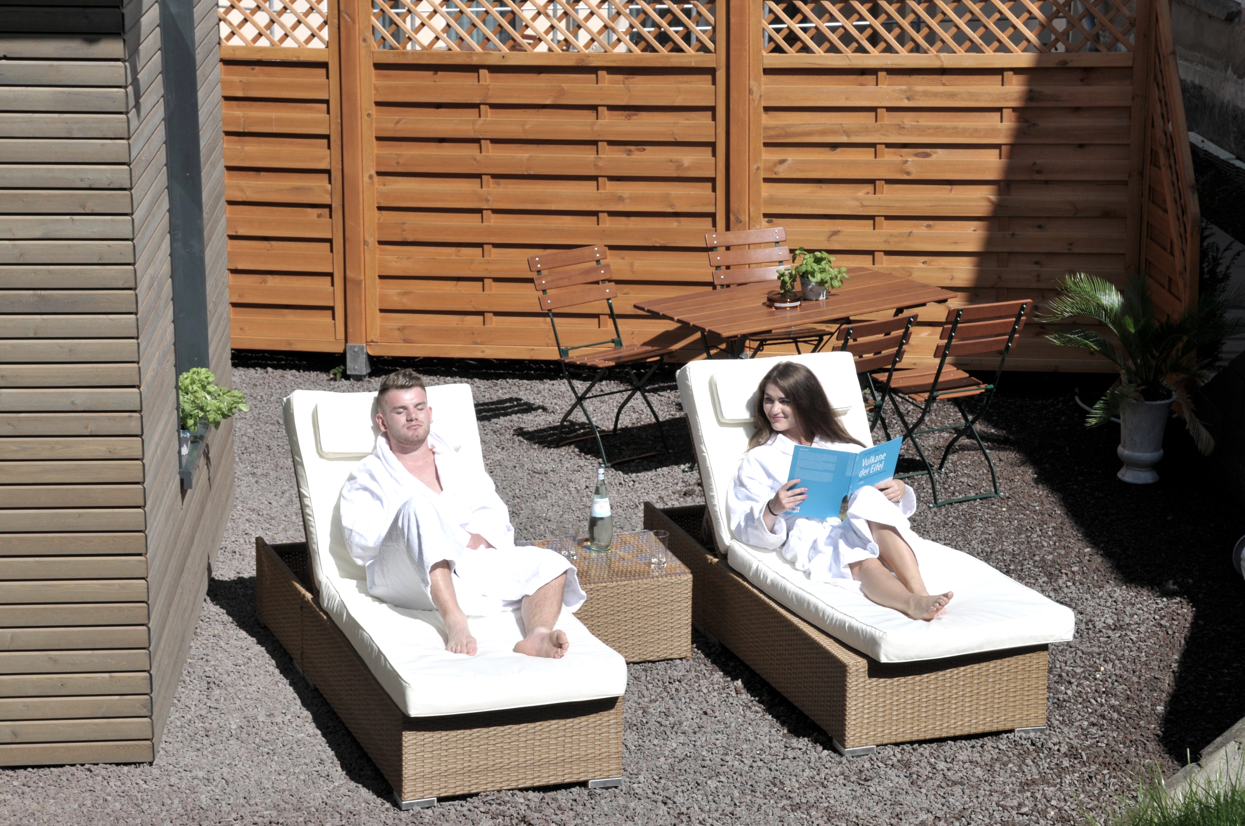 Unsere Vulkangarten-Sauna mit verschiedenen Saunen, Whirlpool, Liegewiese, Ruheräumen, Massage- und Beautyangeboten, Fitnessprogrammen, Meditationskursen und einem Badezuber laden zur Erholung ein.